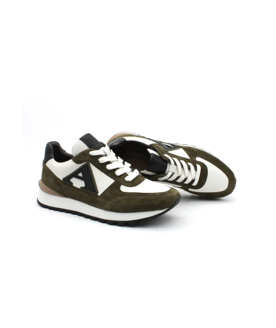 Une basket de ville élégante, un mélange de matière original et une semelle en caoutchouc confortable, la marque française ADIGE dévoile YARI-106 en cuir velours kaki sur une semelle blanche.