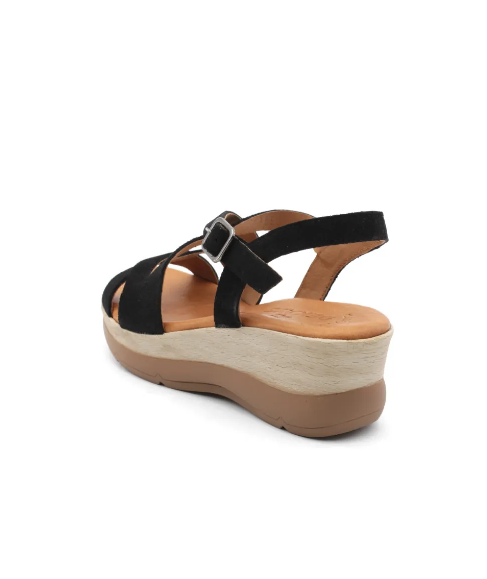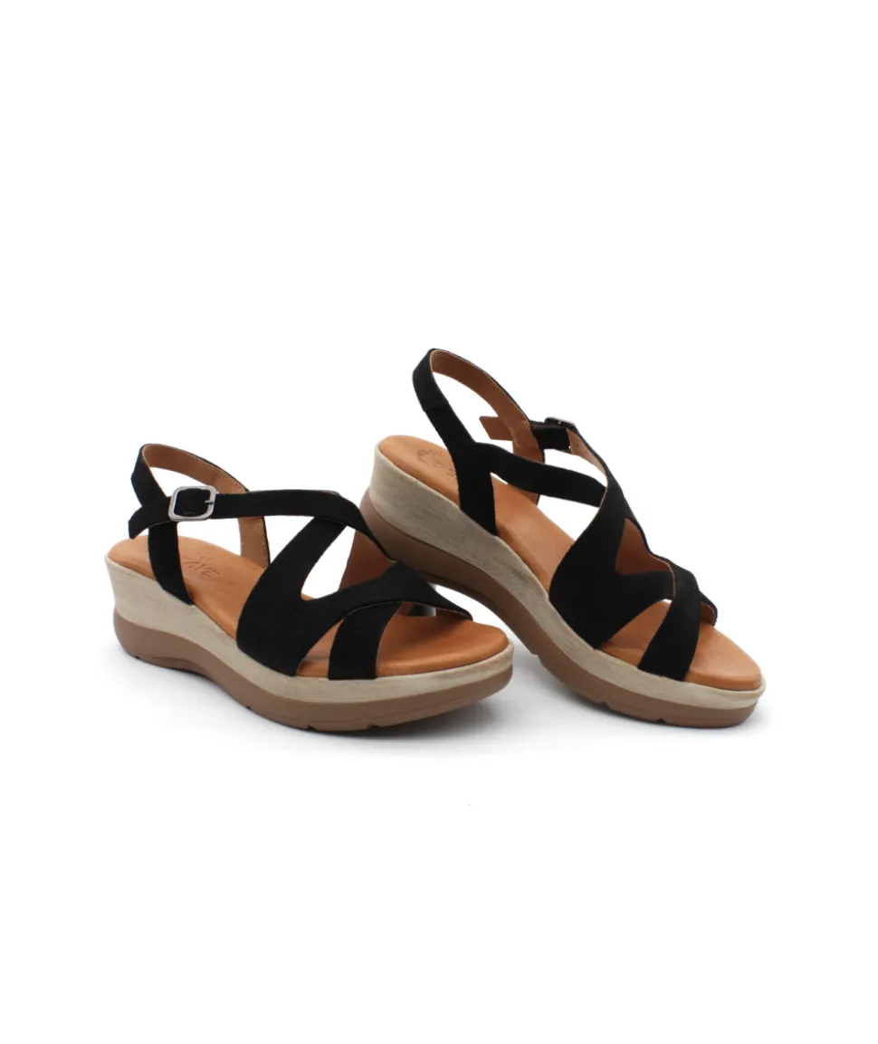 Jolie sandale compensées pour un look chic et décontracté ? Voici la dernière création 1452-F en cuir velours noir de la maison DEKAYE spécialiste des nu-pieds. Sur une semelle en gomme bicolore, la maison espagnole est venus monter des brides croisées sur l’avant du pied remontant jusqu’au réglage cheville pour un maintien optimal. Souple légère, elle sera votre meilleur allié pour cet été !