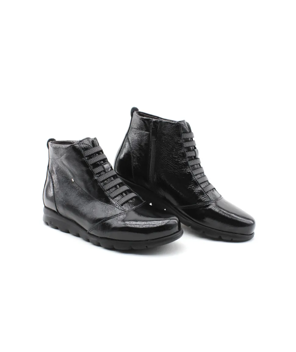 FLUCHOS propose pour la femme à la recherche de confort la bottine SUSAN F0356. Un cuir vernis noir très souple, une semelle gomme légère et un laçage élastique qui procure une grande aisance. Pratique à enfiler grâce à son zip intérieur, ce modèle est un indémodable de la collection de par son look que le confort que cette chaussure montante procure ! Pas de doute, vous n’arriverez plus à vous en passer !