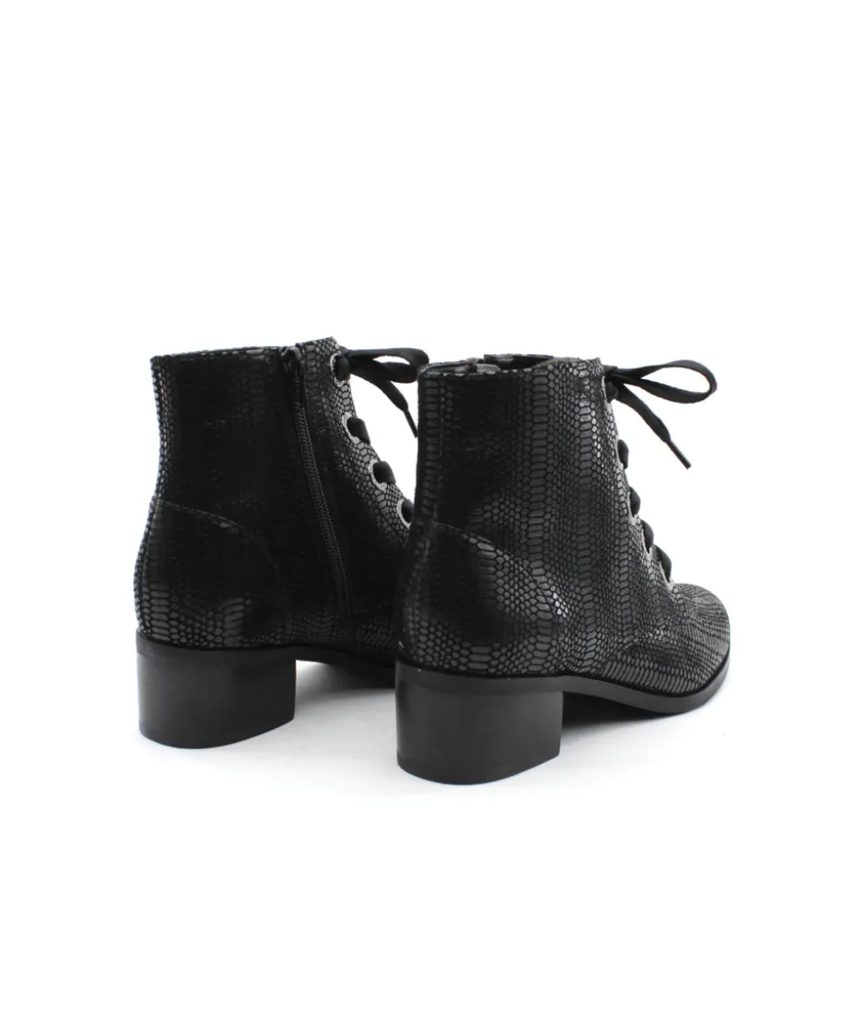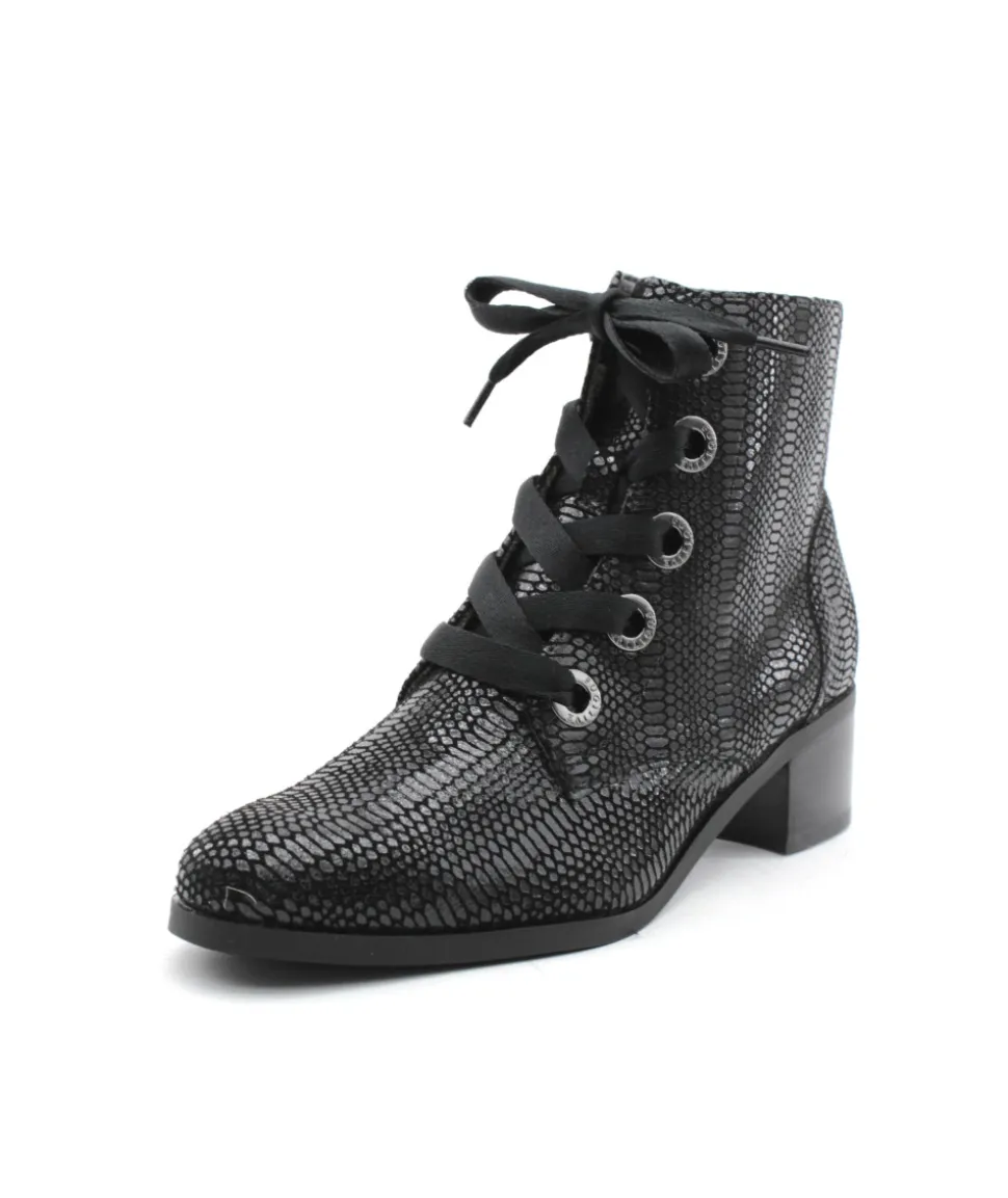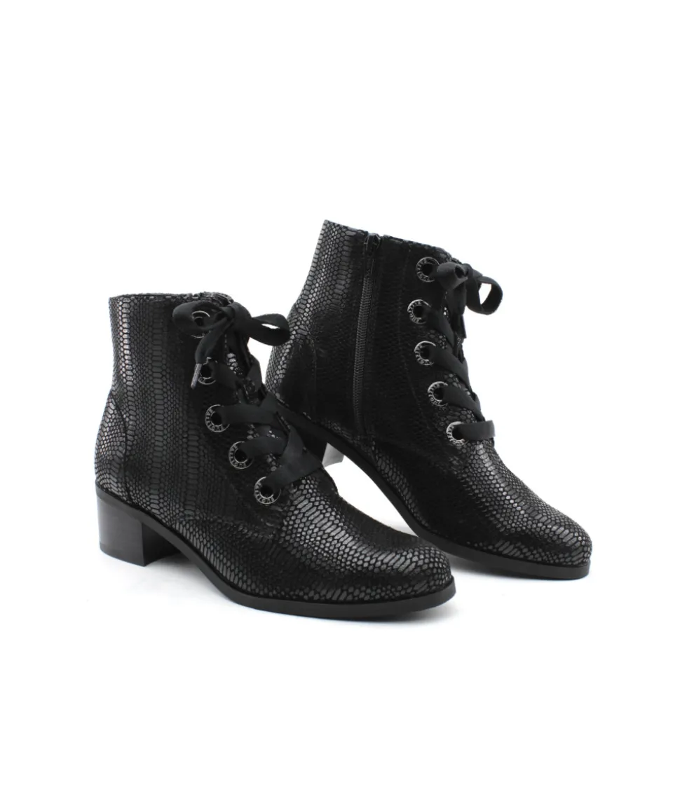 À la recherche d’une bottine confortable qui vous fera prendre un peu de hauteur ? La création RADIEU revient cette saison dans un superbe cuir noir impression python avec ses reflets argentés. Chic et tendance avec ses oeillets imposant et son lacet plat, cette boots vous comblera de bonheur par sa cambrure parfait et son talon de 4 cm. Son originalité et son look atypique ne vous fera pas passer inaperçu.
