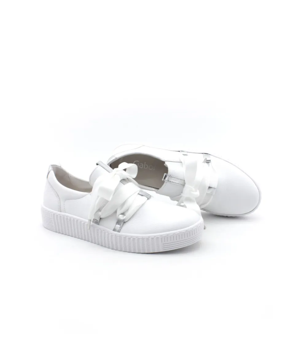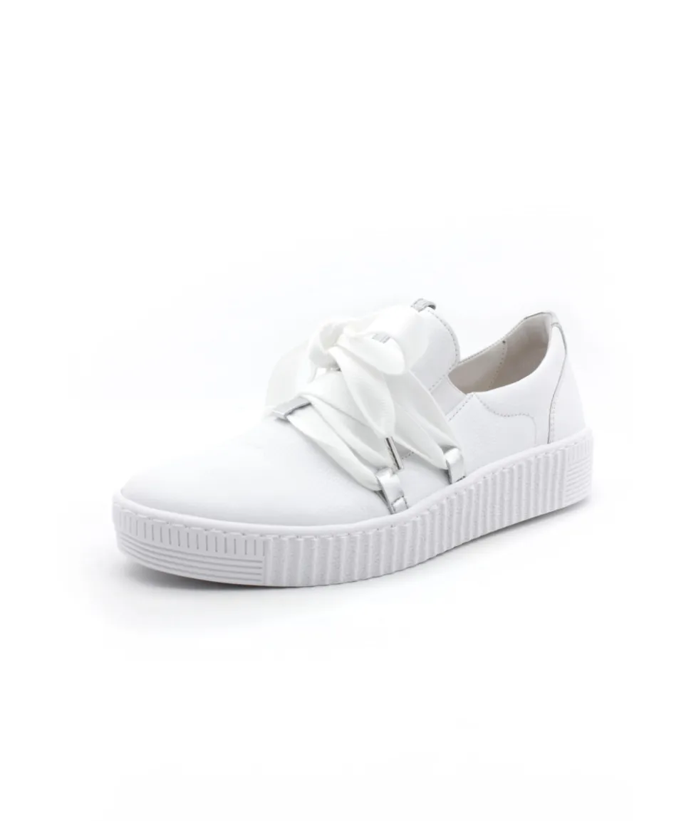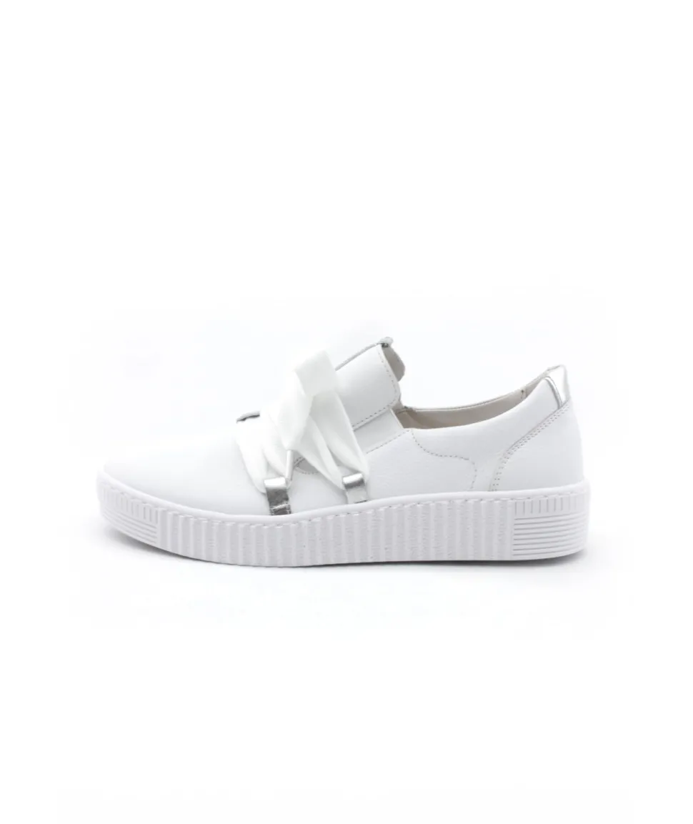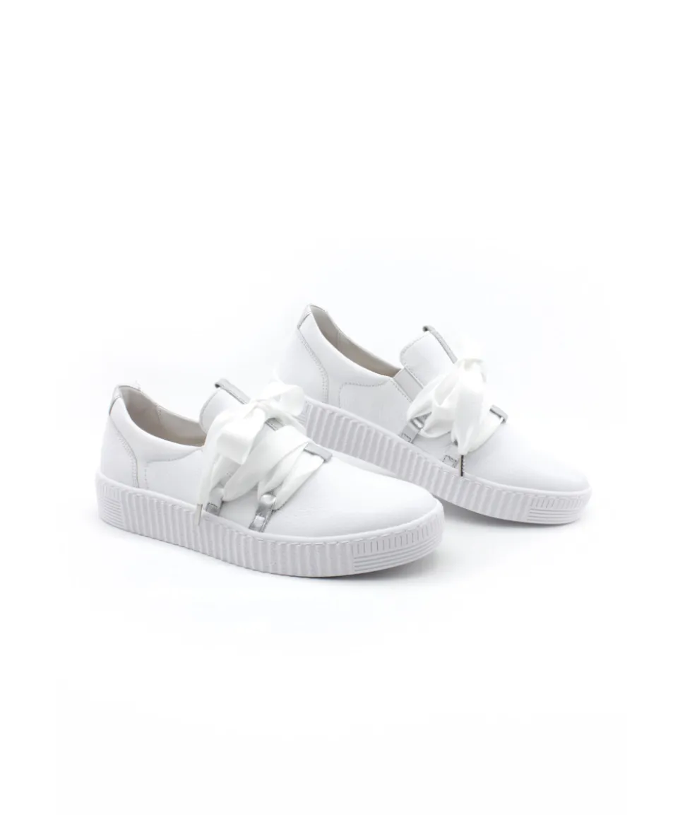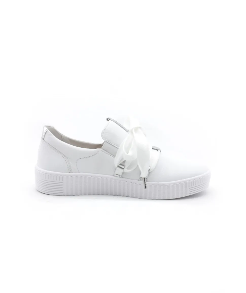 GABOR propose cette chaussure basse en cuir couleur blanc. Un esprit sneakers version SLIP ON et un confort incomparable grâce à sa semelle gomme. On aime le lacet moderne et l’élastique présent de chaque côté qui offre un super maintien ! Mesdames, n’hésitez plus et optez pour ce look ultra moderne !!
