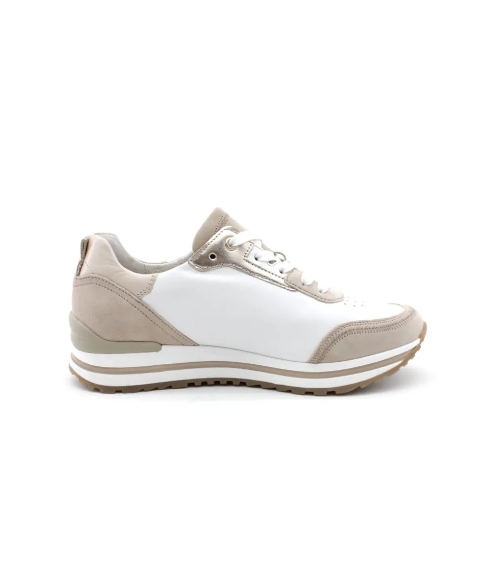 La maison allemande GABOR nous dévoile sa dernière création, le modèle 26.525.54 dans son coloris blanc associé à des empiècements beiges et des touches dorés vous fera craquer par sa légèreté et son confort de marche. Avec une semelle amovible, un zip de fermeture et un lacet ces sneakers sport chic deviennent le modèle pratique et tendance qu’il vous faut !