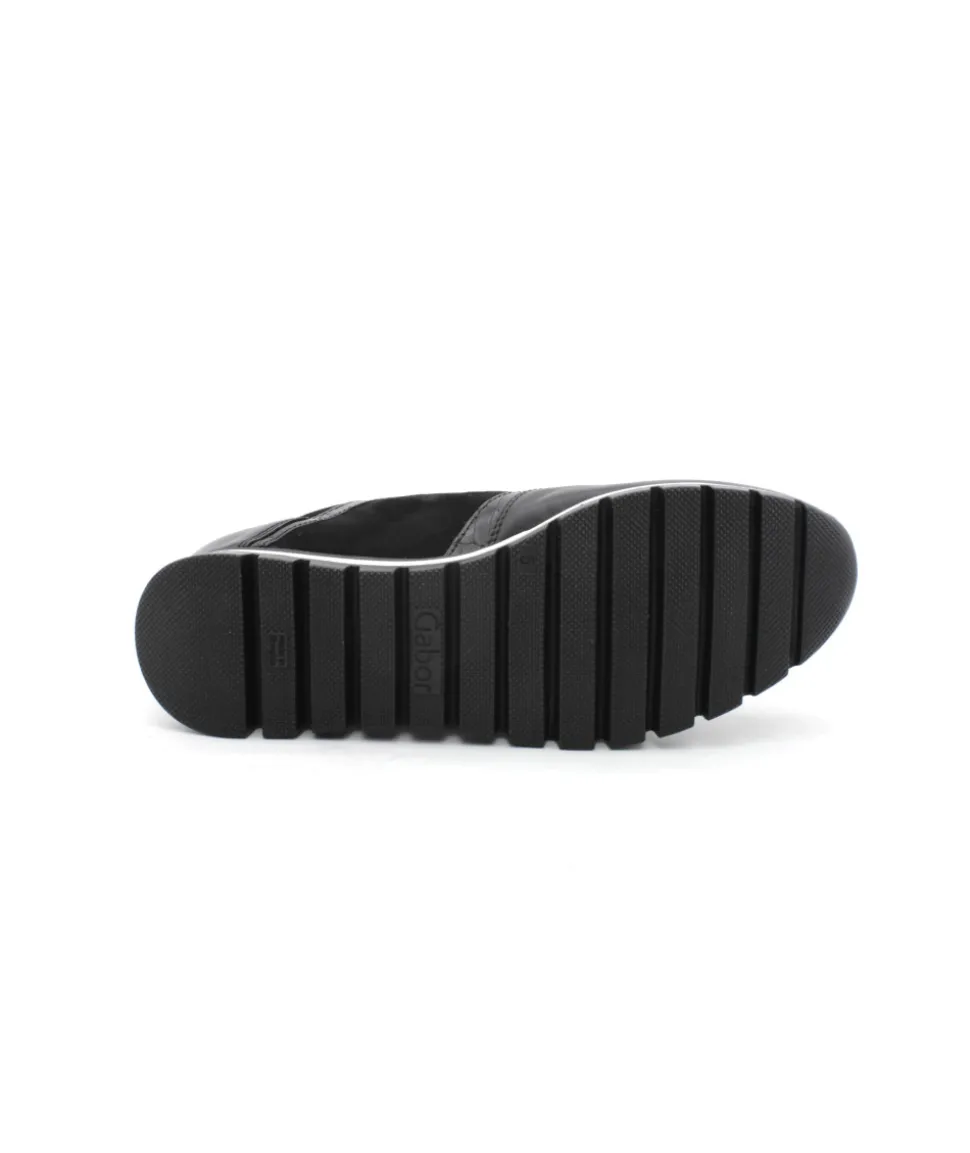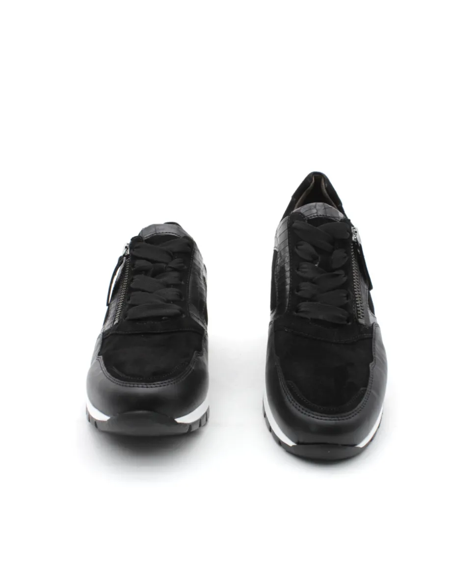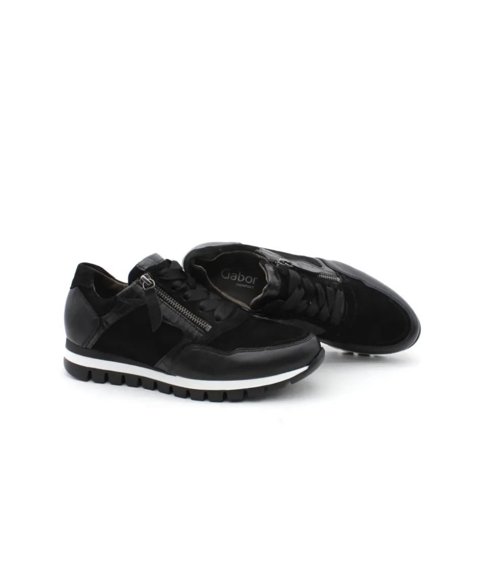 À chaque femme sa paire de basket. Cette fois, nous vous présentons la nouvelle GABOR 36.438.67 en cuir velours noir accompagnée d’empiècements en cuir lisse et croco. Chic et élégante, cette paire de sneaker confortable se montre à l’aise dans toutes les situations grâce à sa semelle rainurée qui offre beaucoup de souplesse. Son lacet viendra s’ajuster à votre pied tandis que ses zips de fermetures vous faciliteront l’enfilage. Plus de doute, c’est la paire qu’il vous faut !