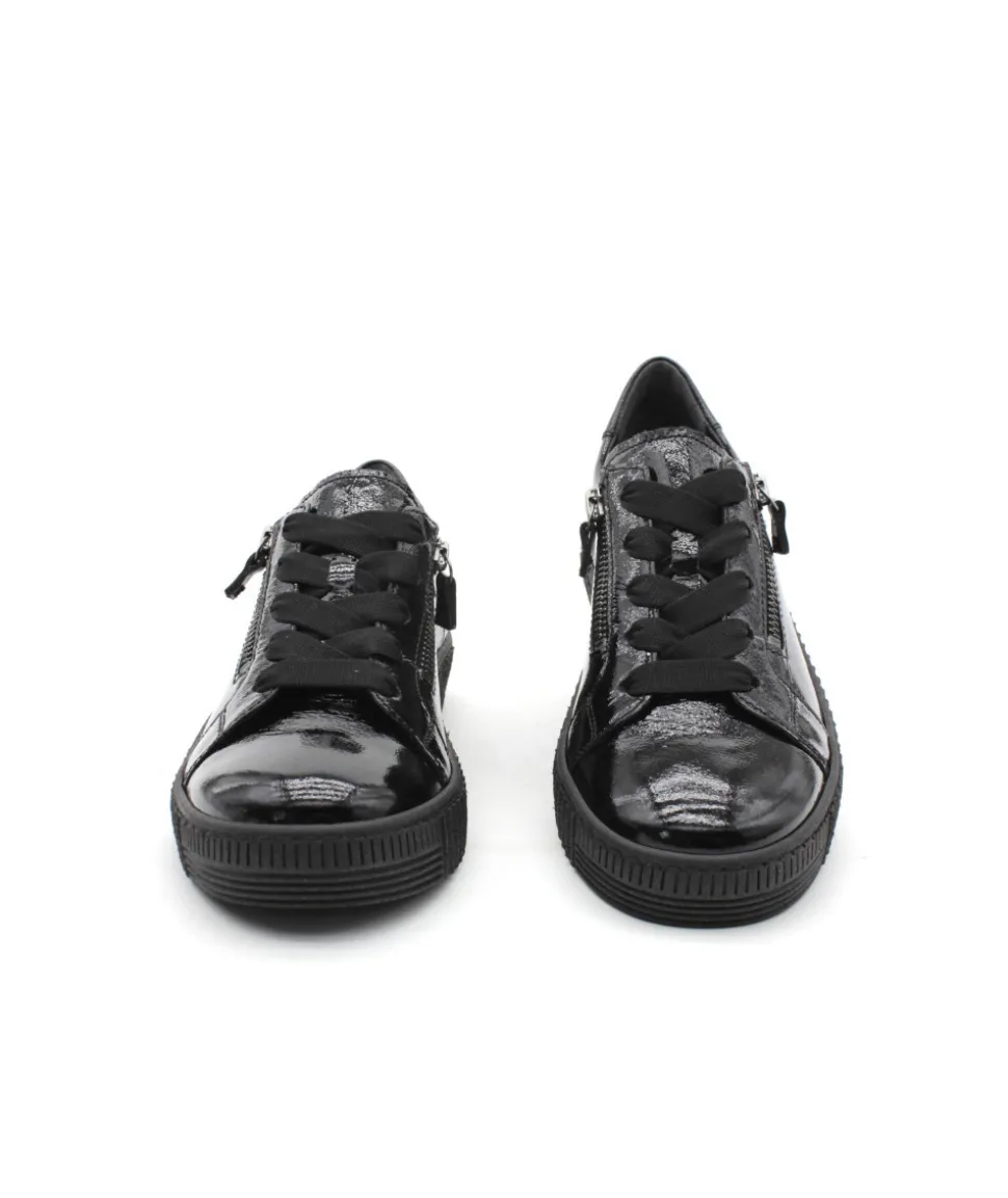 On ne présente plus la basket phare de GABOR. Pour cette nouvelle saison, la maison allemande relance sa sneaker sport chic en cuir vernis noir qui lui donne un look moderne et indémodable. Son cuir apporte beaucoup de souplesse tandis que son lacets et son zip maintienne le pied pour un maximum de confort. Vous ne serez jamais déçu par ce modèle !