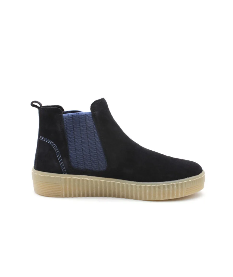 Bottine type Chelsea résolument moderne: elle est dotée du Best Fitting Gabor : plus de largeur sur l’avant pied pour plus de confort et dispose également d’une première amovible. Un dessus en velours bleu marine et une doublure micro pour votre confort intérieur, elle dispose également d’une semelle de marche Gomme légère au look actuel…Bref : un Must Have Gabor, absolument !