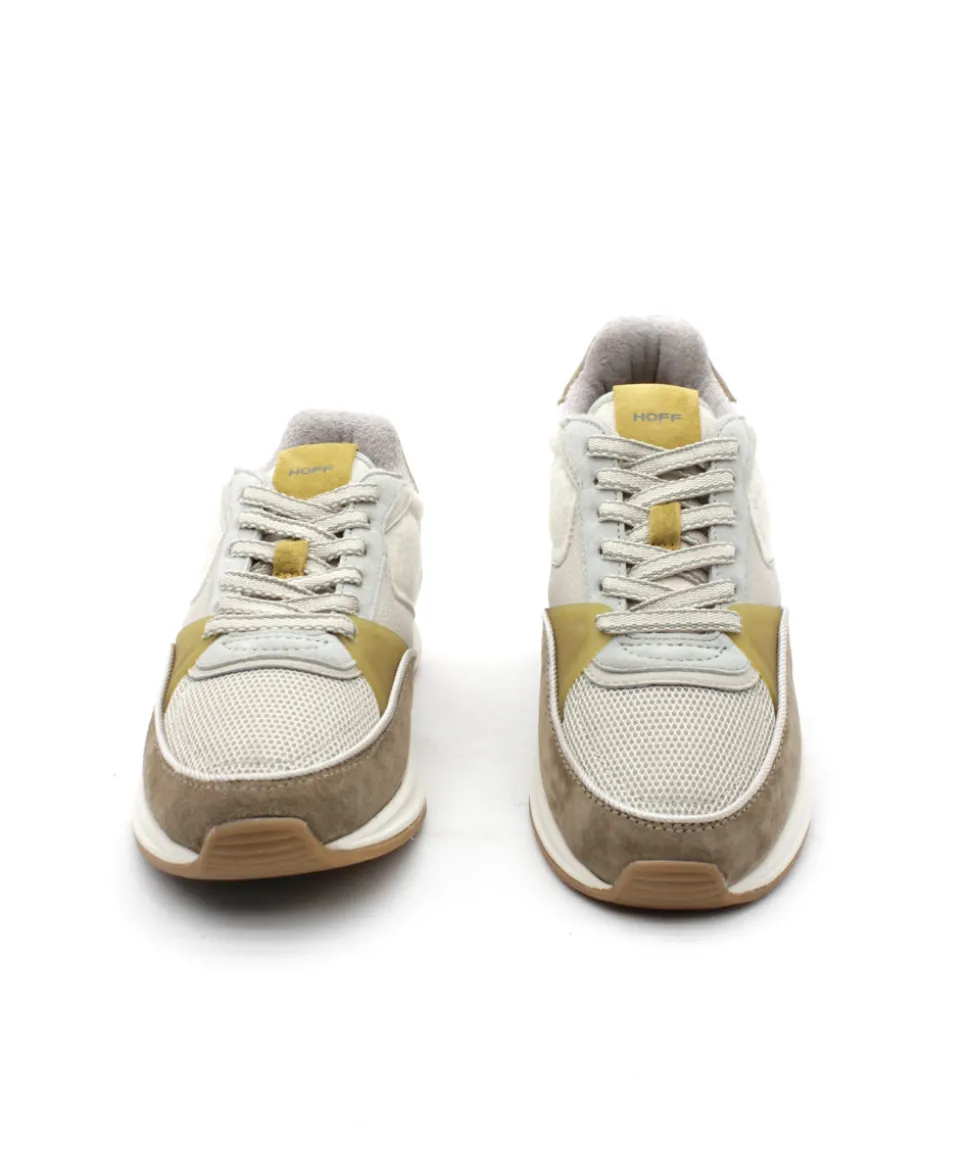 Sneakers ultra-tendance et branchée, le concept de la marque espagnole HOFF est simple, chaque baskets portent le nom d’une ville différente dans le monde. Leurs semelles apporte un rendu colorée et atypique. Une chaussure unique en son genre qui n’a pas fini de vous surprendre ! Le modèle GRACIA mélange les couleurs et les matières avec du blanc, ivoire, taupe et jaune moutarde pour un résultat original. Le look streetwear de cette basket au allure sport chic s’adaptera facilement à votre garde robe alors n’attendez plus !
