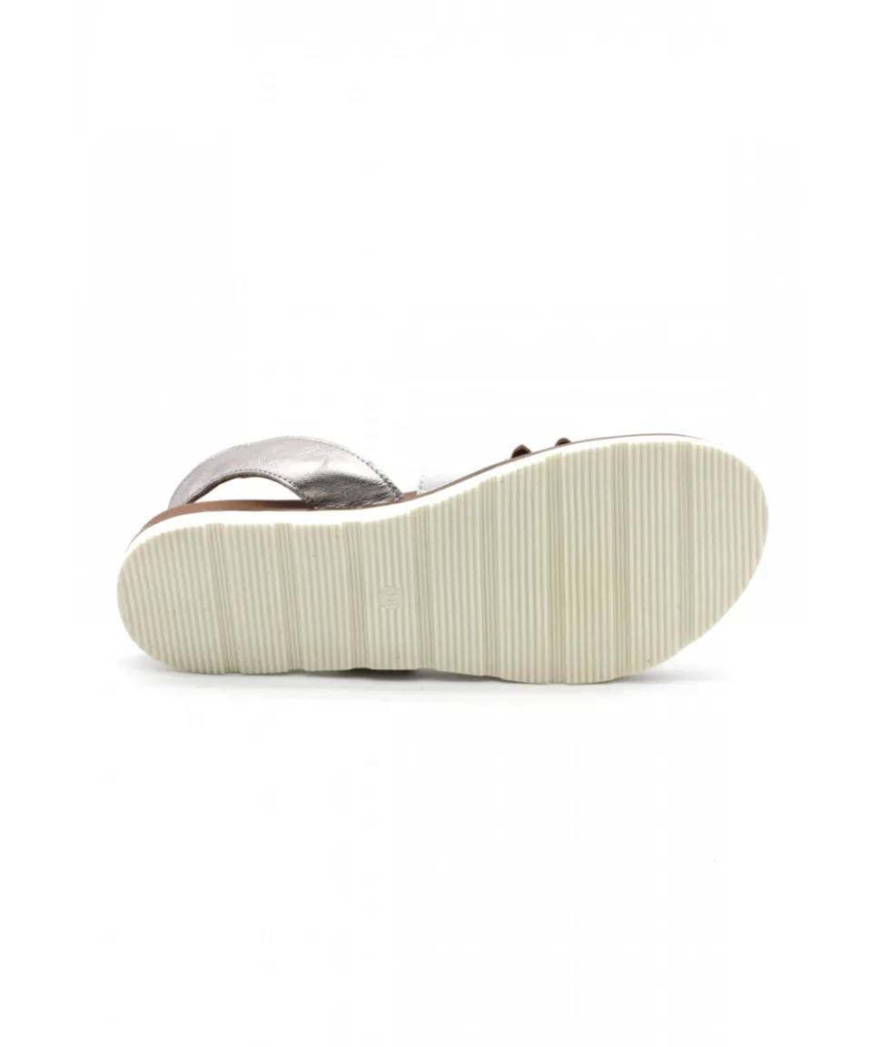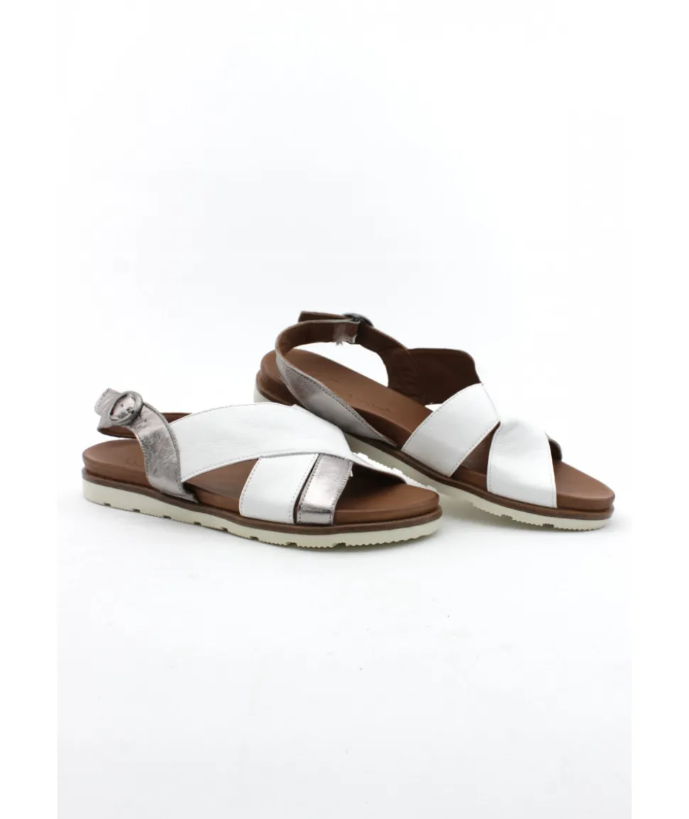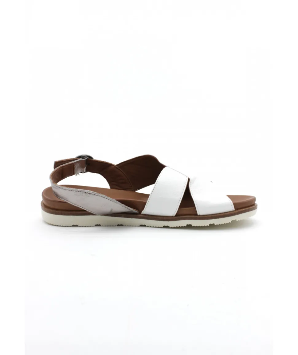 Nu-pieds en cuir BLANC ET CAMEL proposé par la marque Portugaise LUNE et L’AUTRE. Il s’ajuste par une bride à boucle sur l’arrière du pied. Une semelle caoutchouc blanche très confortable vient compléter cette sandale.