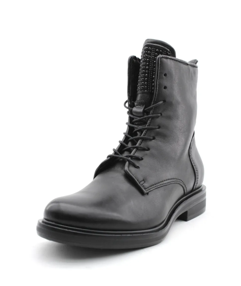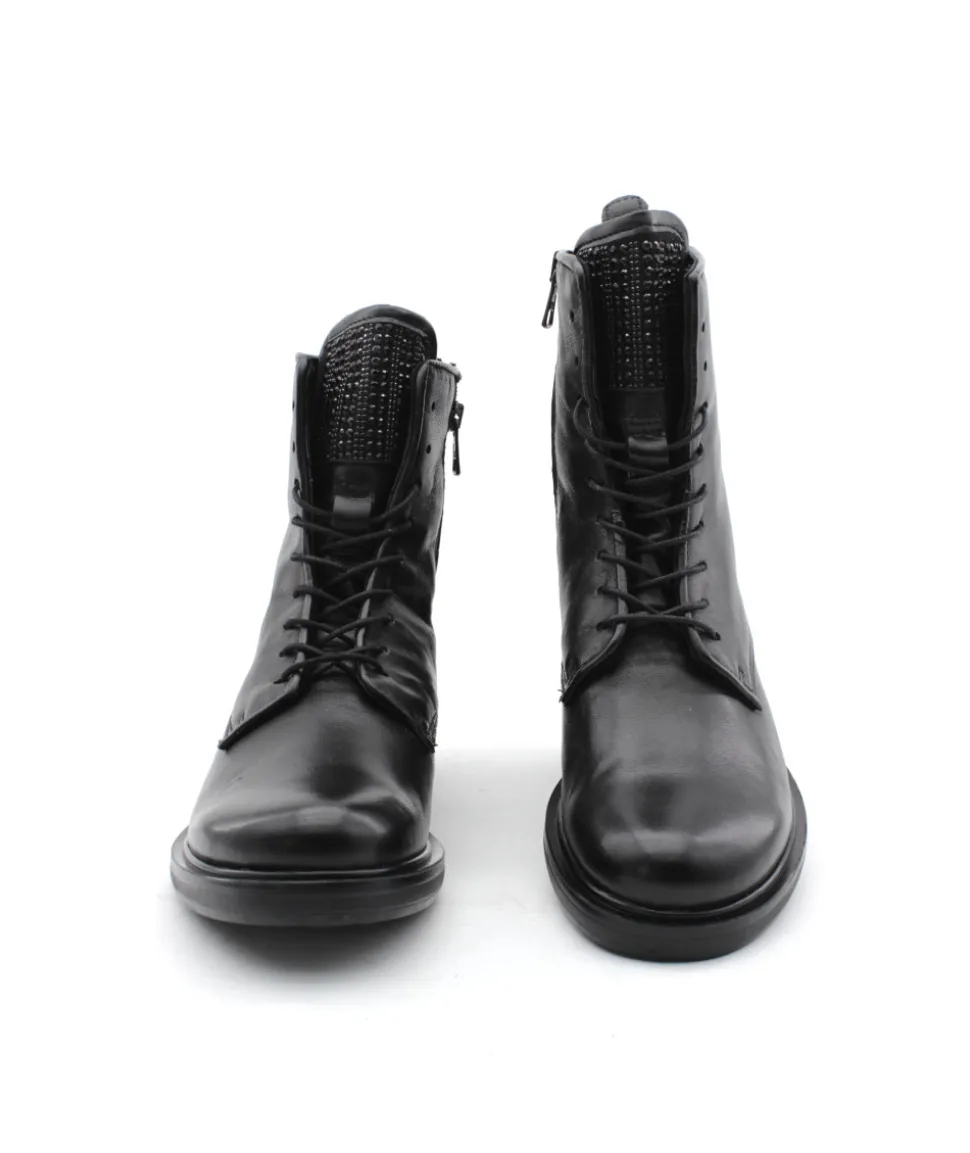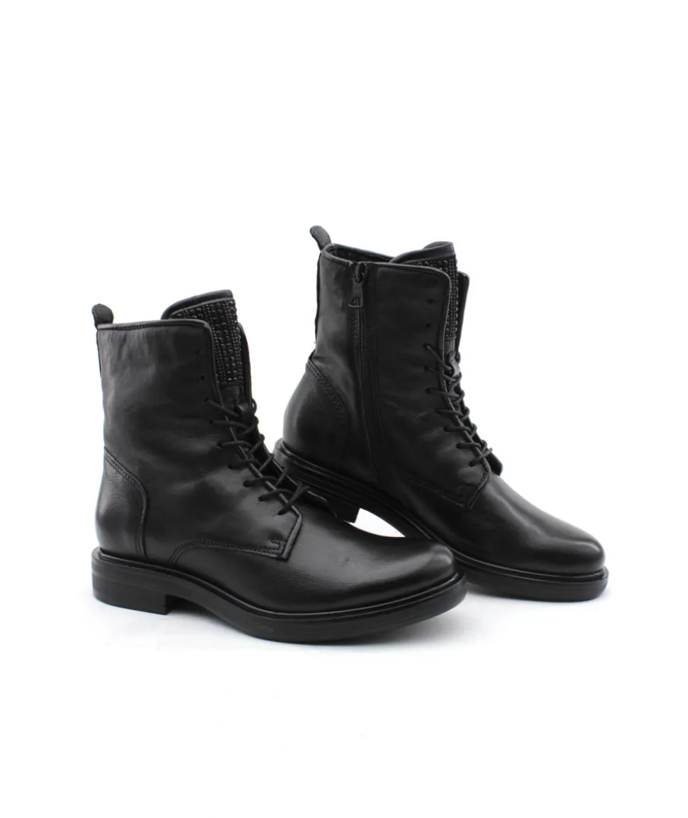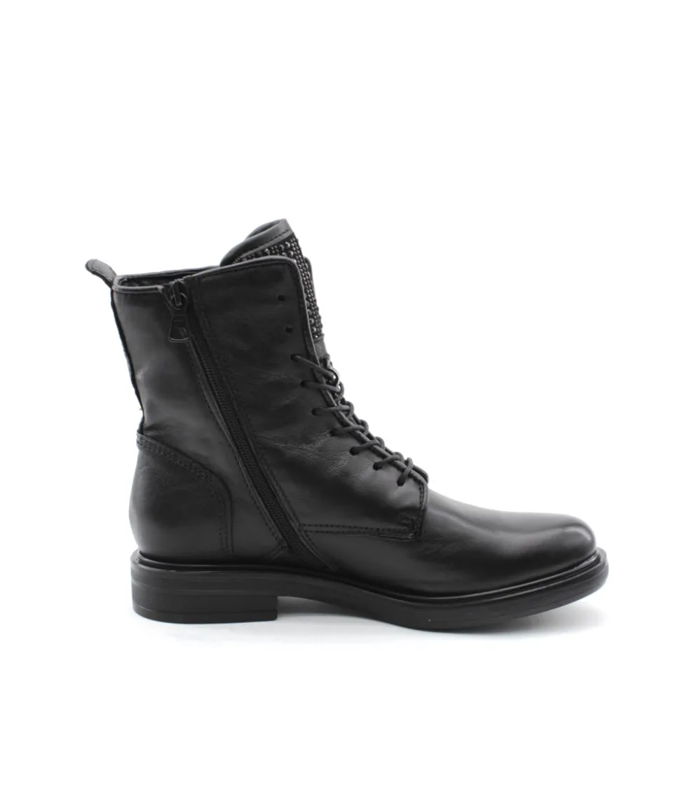 Immanquable de la collection, Mjus revient cette saison avec cette jolie bottine pour femme en cuir noir. Le modèle M64235 s’équipe d’une semelle épaisse en gomme pour un confort accru, d’un lacet pour un serrage optimal et d’un zip intérieur pour plus de praticité lors de l’enfilage ! Rien de mieux pour affronter l’hiver et garder les pieds au chaud grâce à sa doublure en textile recyclé. On aime les bijoux sur le haut de la languette qui affirme un look plus féminin.