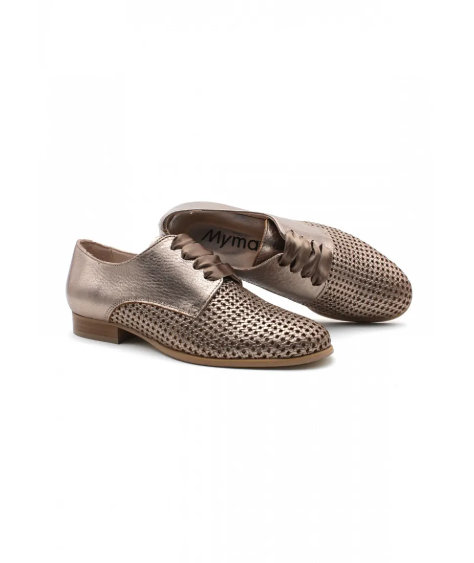 À la recherche d’un joli derbie pour femmes ? Voici le nouveau modèle 5321/00 de la marque MYMA sur un magnifique cuir métallisé bronze. Sur un talon de 2 cm et une semelle en élastomère pour plus de légèreté, c’est le derbie parfait pour cet été.