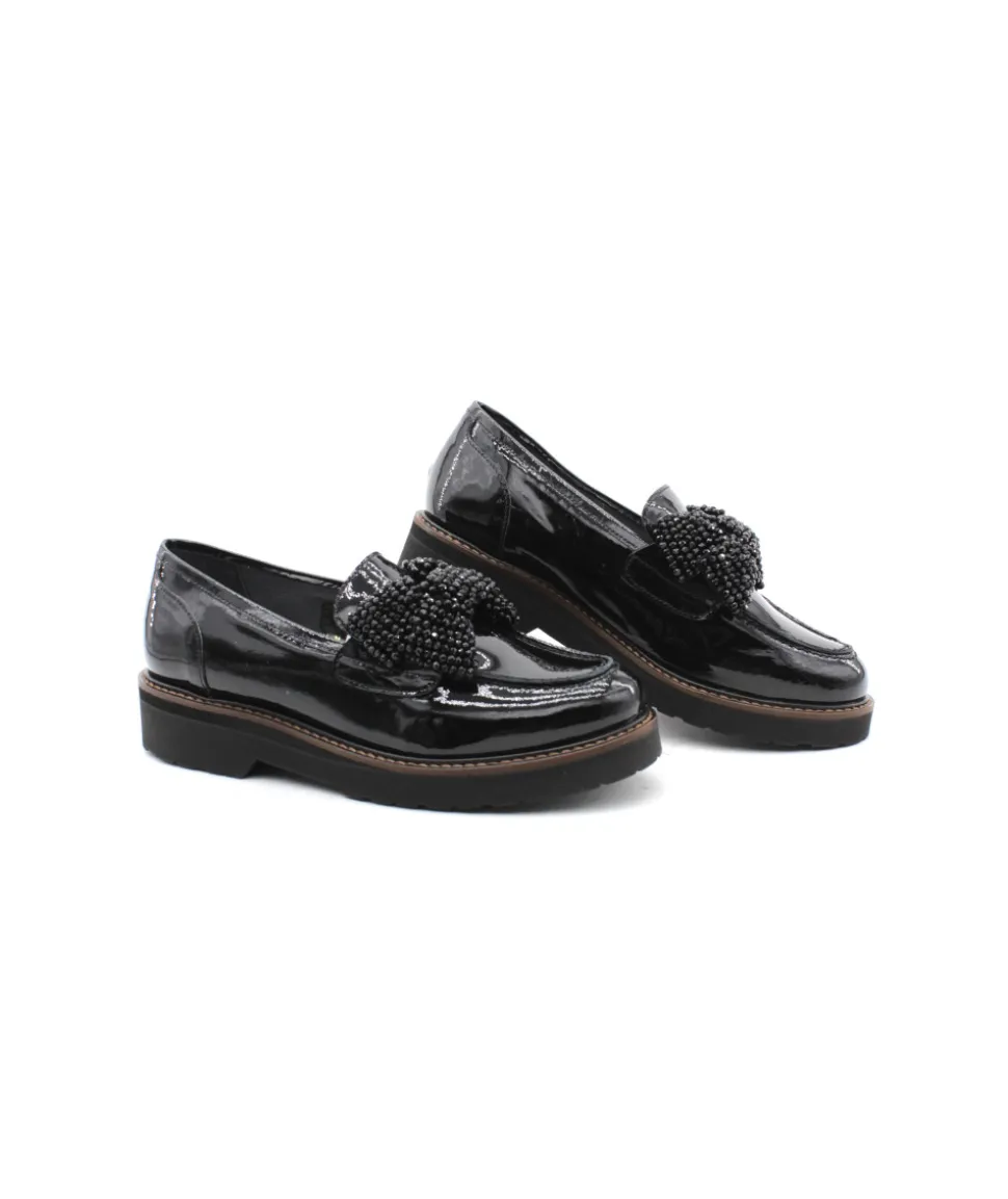 Nouvelle création de la maison française Myma avec ce mocassin en cuir vernis noir 5815/00. Un look moderne et féminin grâce à sa semelle épaisse, son cuir vernis et son noeud orné de strass. Énorme tendance, le mocassin se fait une place de choix dans le shoesing des femmes ces dernières années. Chic et raffiné, comme vous, ces chaussures s’associeront facilement à vos robes, jupes, pantalons à pinces…