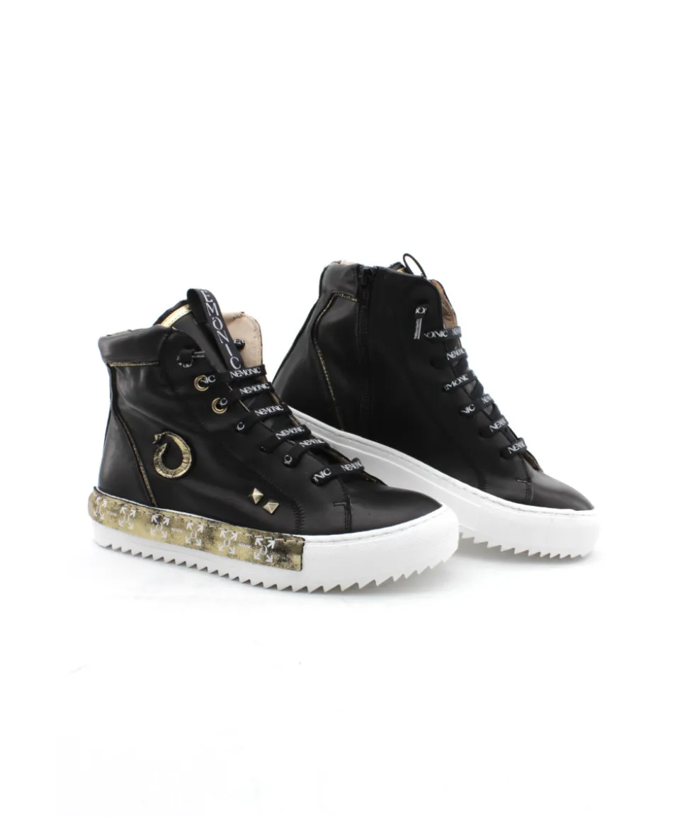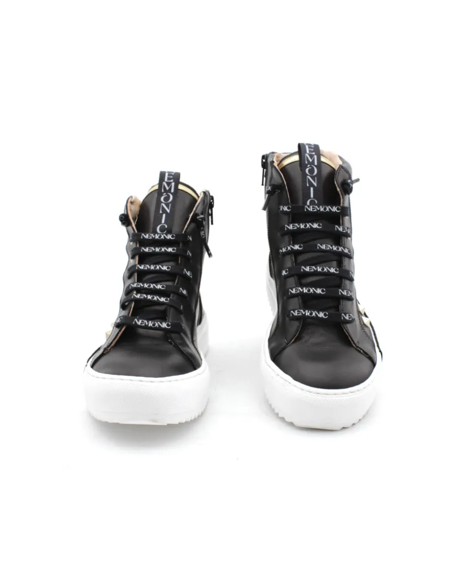 Fraichement designer, les nouvelles baskets montantes Nemonic 2250 font leurs arrivées dans la collection L’Empreinte Chaussures. Sur une base en cuir noir, la marque espagnole a ajouté des touches dorées sur le contrefort, les oeillets et le logo. Aussi atypique que le reste de la collection, cette basket reçoit une semelle blanche habillée d’une bande dorée et d’un imposant logo sur la languette… Avec ceci, pas de doute, vous ne passerez pas inaperçu !