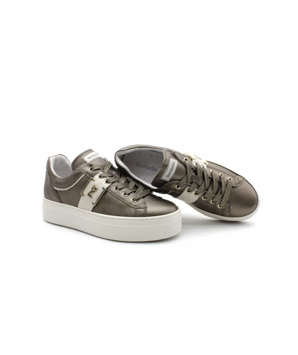 Énorme coup de coeur sur ce modèle de basket NEROGIARDINI. Le modèle 05300 apporte un rayon de soleil sur son cuir bronze et noir grâce à ses oeillets couleur or. Légère et confortable, ces sneakers pour femmes au look casual chic vous ferons toutes craquer !