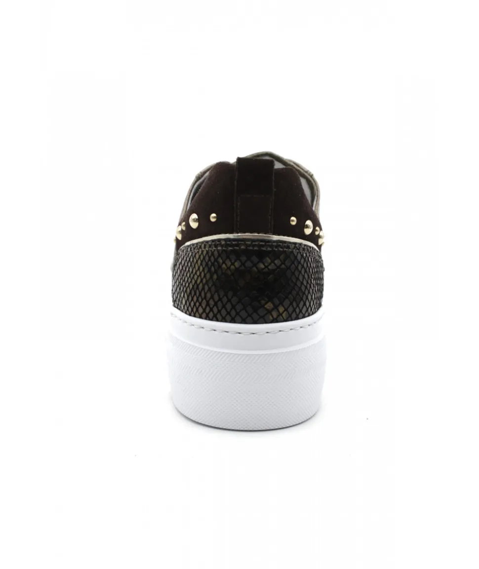 À chaque femme sa paire de basket. La maison italienne Nerogiardini nous dévoile son savoir faire avec cette sneaker 05310 et son cuir bronze, magnifique. Le contrefort s’habille d’un cuir imprimé serpent et de jolis clous dorés.