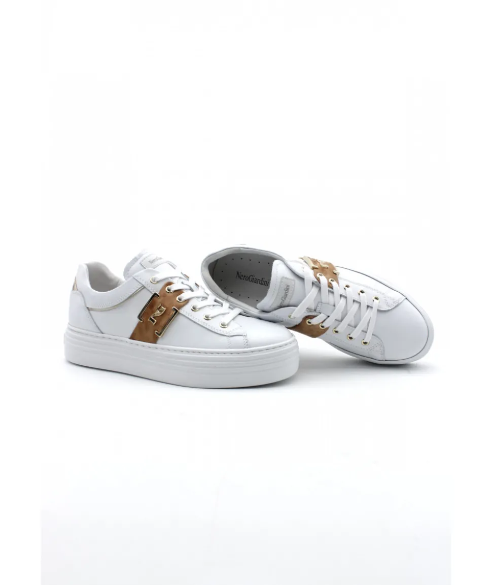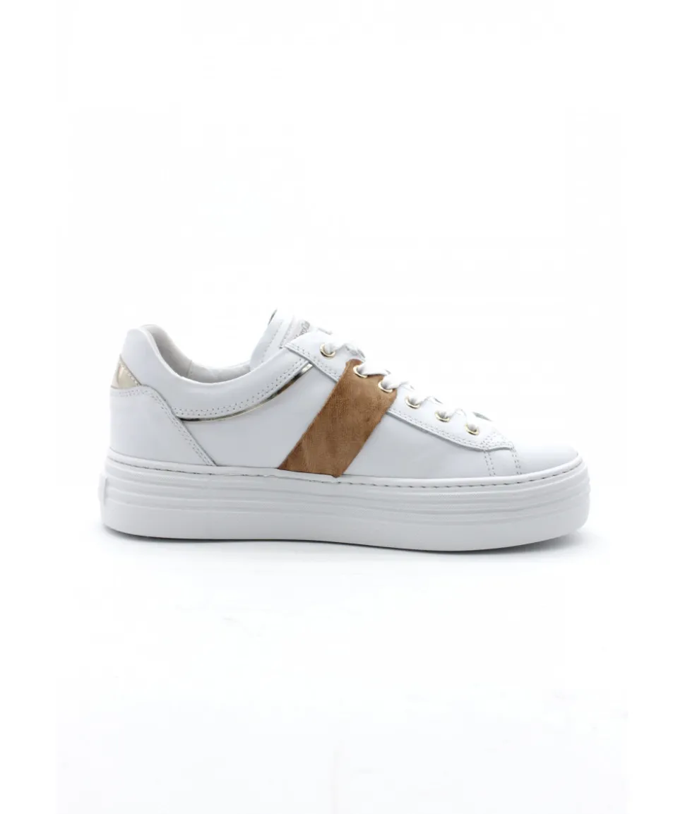 Énorme coup de coeur sur ce modèle de basket NEROGIARDINI. Le modèle 18132 apporte un rayon de soleil sur son cuir blanc grâce à ses oeillets couleur or. Légère et confortable, ces sneakers pour femmes au look casual chic vous ferons toutes craquer !