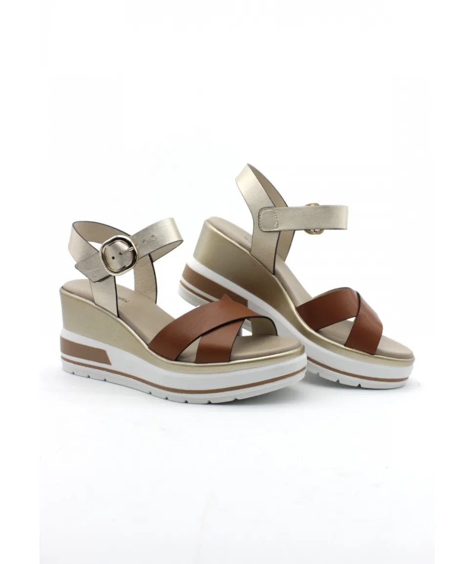 À la recherche d’une sandale compensée élégante, chic et tendance ? Voici la toute dernière 18737 de la maison italienne NEROGIARDINI dans son cuir cognac ou blanc. Sur un magnifique bloc compensé en gomme couleur blanc et or, ce nu-pied est le must-have de la saison estivale.