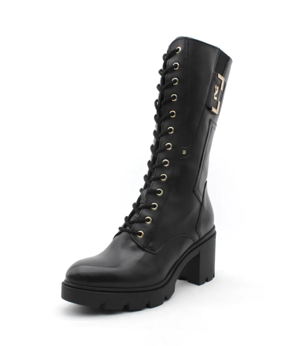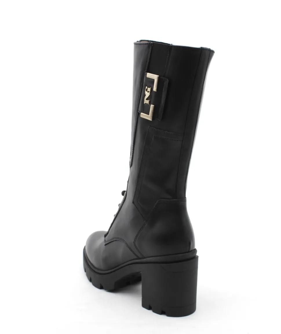Magnifique botte pour femme en cuir noir. Voici la dernière création de la maison italienne Nerogiardini avec sa botte à lacets I205862D. Une création toute en élégance, à l’image du savoir faire italien. Perchée sur un talon de 7 cm, cette chaussure pour femme s’équipe d’un zip intérieur et de son logo version boucle décorative apposé sur le haut de la tige. Facile à enfiler grâce à son zip, vous pourrez les porter tous les jours avec chacune de vos tenues… Robes, Jeans et jupes ne seront pas en reste avec cette chaussure tendance et féminine.