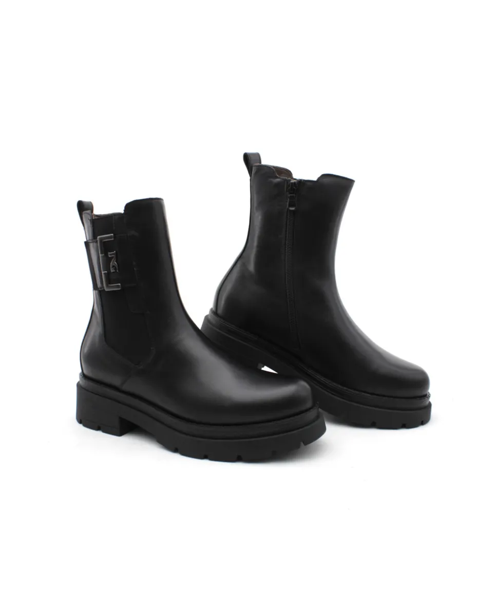 Magnifique boots pour femme en cuir lisse noir. Voici la dernière création de la maison italienne Nerogiardini avec sa bottine I309150D. Une création toute en élégance, à l’image du savoir faire italien. Perchée sur un talon de 4,5 cm, cette bottine s’équipe d’un zip intérieur pour la praticité et d’une boucle décorative sur la tige élastiquée. Facile à enfiler grâce à son zip, vous pourrez les porter tous les jours avec chacune de vos tenues… Robes, Jeans et jupes ne seront pas en reste avec cette chaussure tendance et féminine.