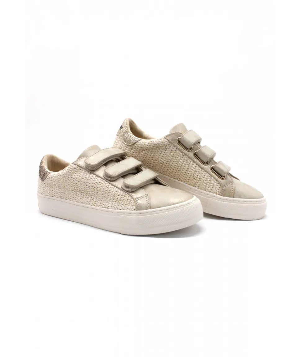 NO NAME décline sa sneaker dans une version à scratch avec l’ARCADE STRAPS. Un modèle décomplexé qui marie à la perfection le style de son cuir métallisé beige dorée et le côté excentrique de son raphia naturel.