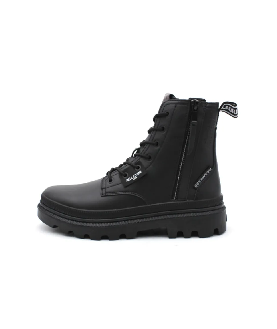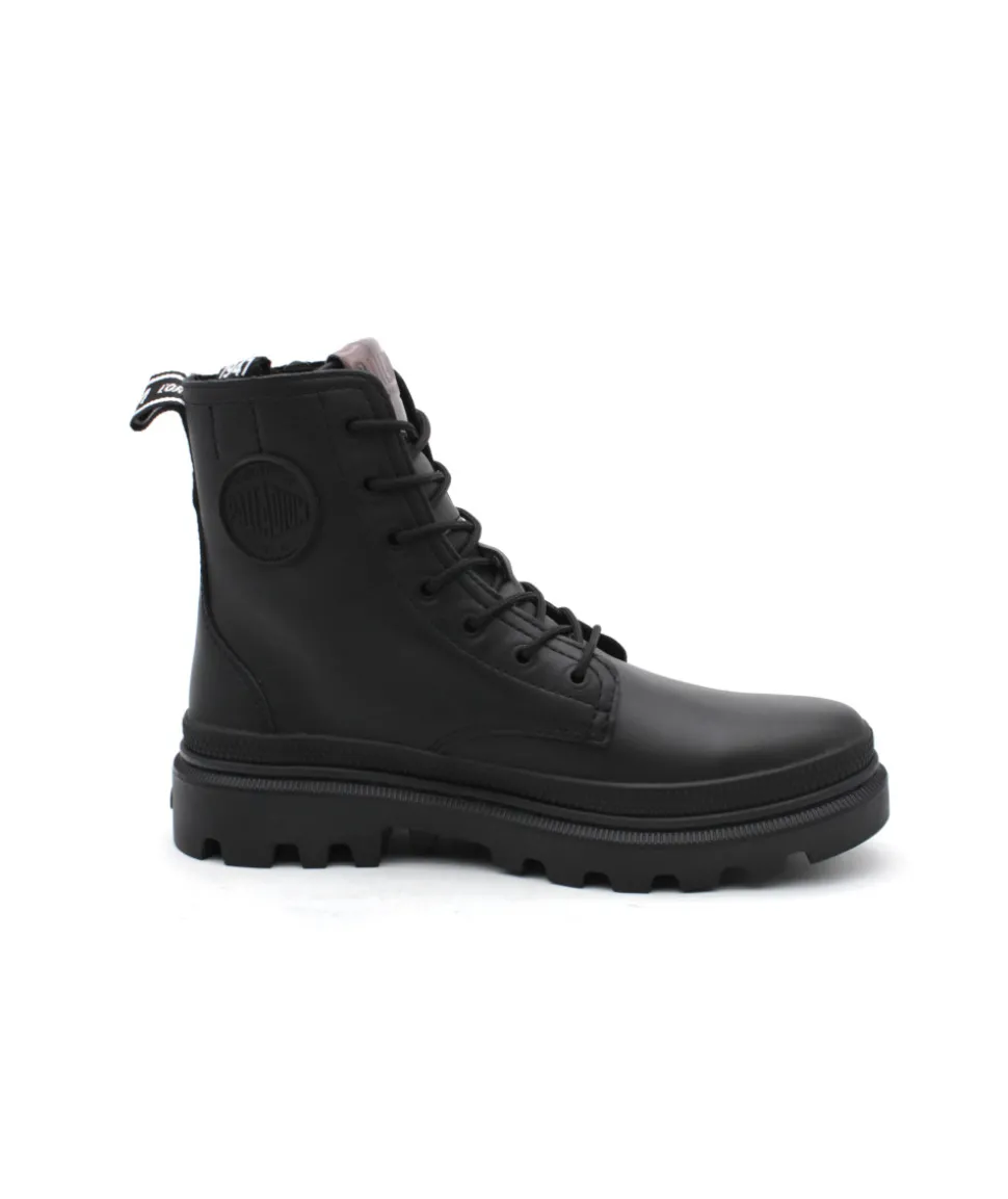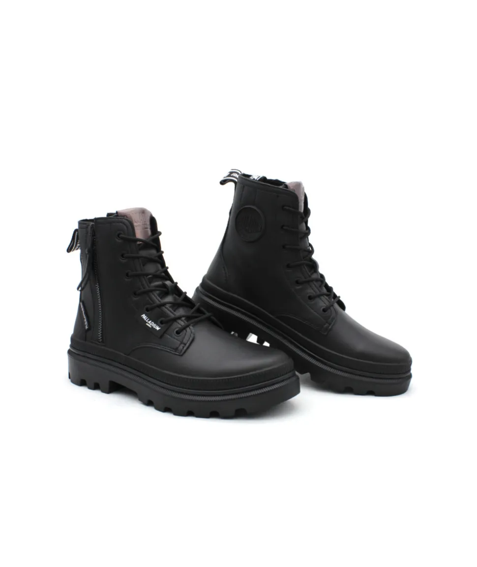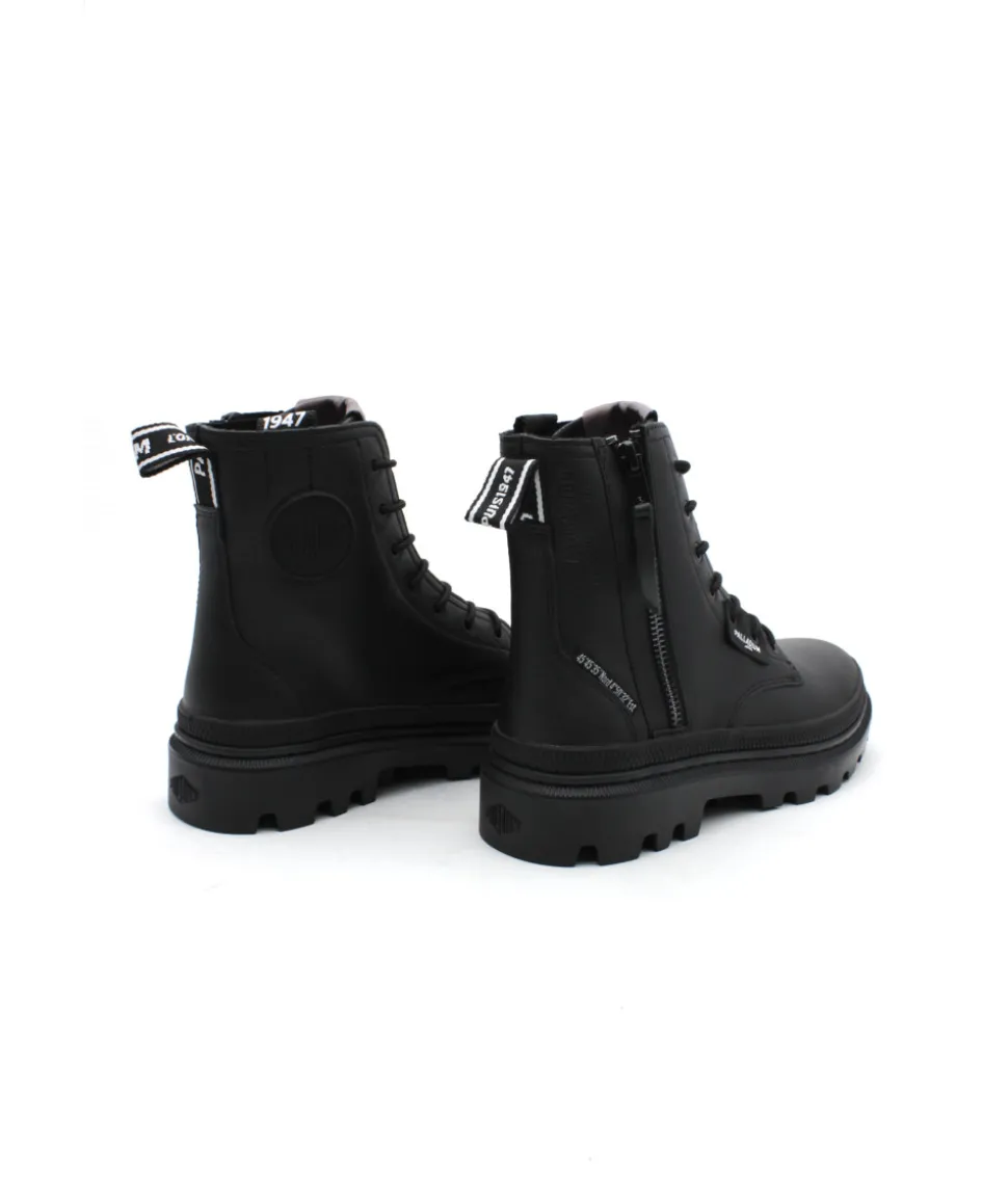 Palladium revient en force cette saison avec son nouveau modèle PALLATROOPER ZIP L en cuir noir. Une bottine au look ranger qui donne un style rock à vos tenues ! Sa semelle épaisse en caoutchouc, ses lacets ronds et son zip extérieur, lui donnent un charme fou… Palladium revient sur ces premiers designs en y apposant fièrement son logo sur différentes parties de la chaussure afin d’apporter une touche moderne à une collection rétro, très tendance.