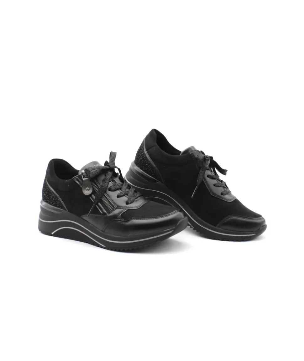 Cette basket compensés D0T01-01 dans sa version noir de Remonte à tout pour plaire, de plus, elle dispose d’une très bonne largeur. Grâce à son tissu stretch elle apporte un maximum de souplesse et de confort pour vos pieds. Doté d’un zip latéral ainsi que d’un lacet, enfiler votre basket n’a jamais été aussi facile. Bonus : elle embarque avec elle la technologie Lite’N Soft : Plus de largueur sur la chaussure, semelle amovible, soutien de voute plantaire, légère et souple.