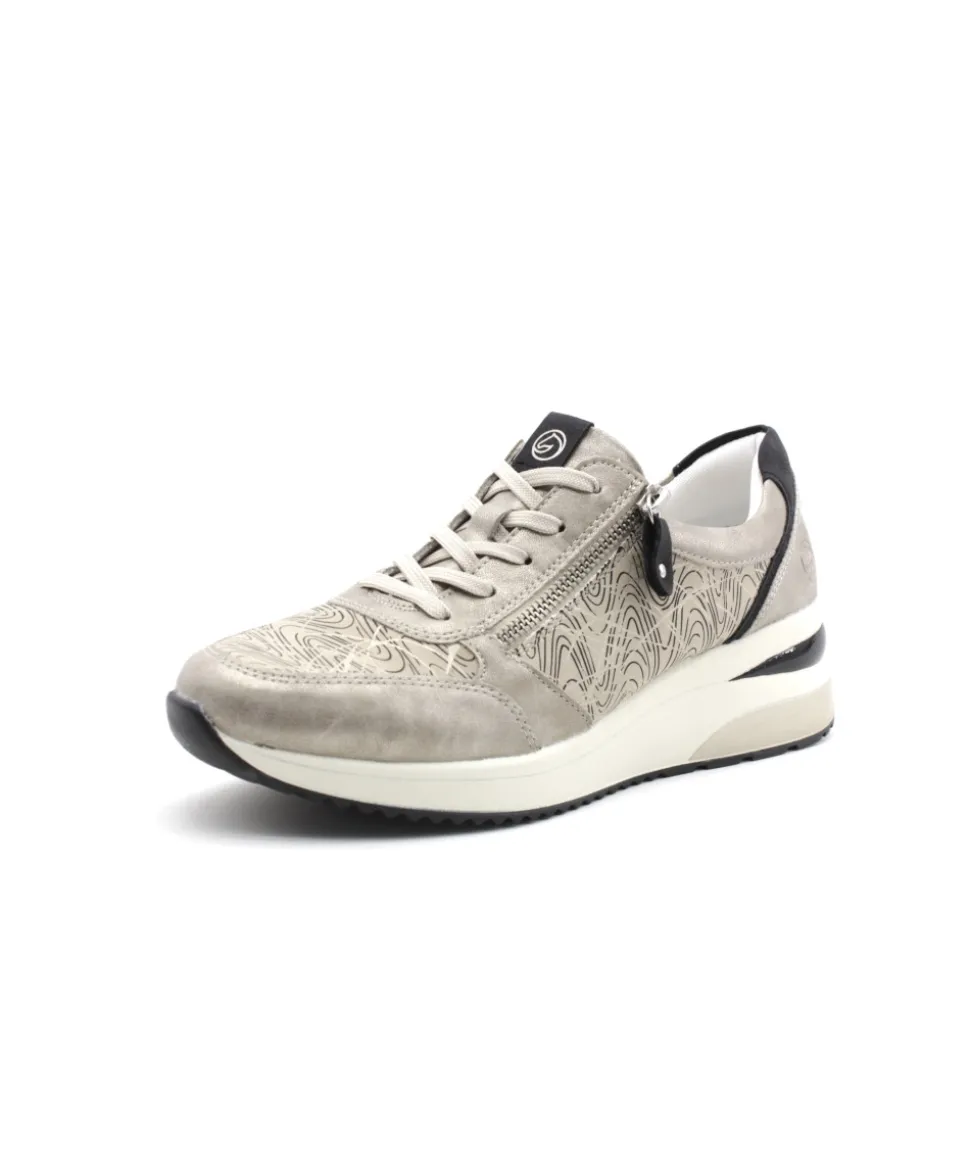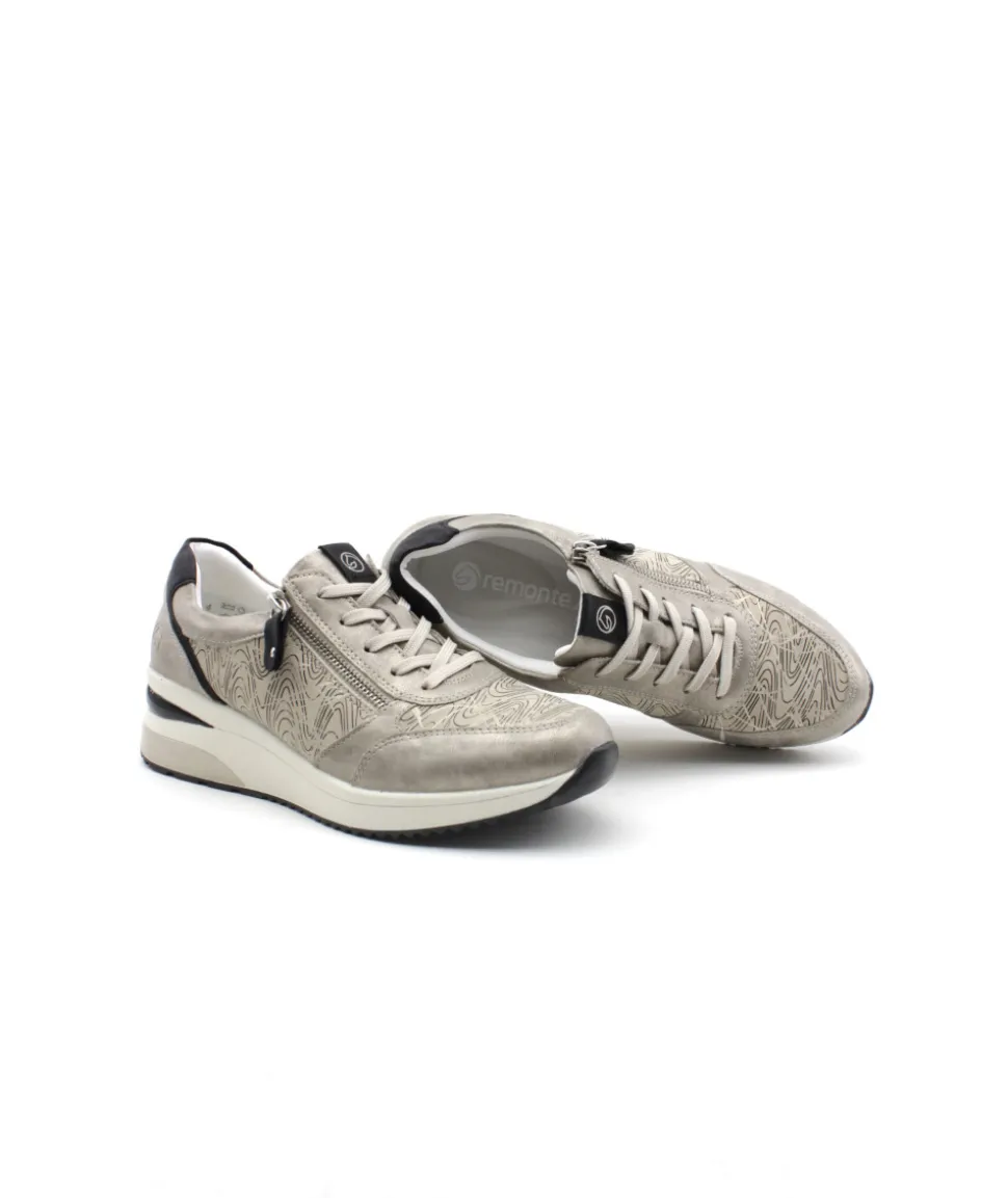 Pour se sentir libre, adopter Remonte !!! Remonte D2400-60 est une tennis femme en cuir couleur argent platine. Cette tennis Remonte est facile à chausser grâce à son lacet et sa fermeture éclair. Ce modèle de tennis Remonte est doté d’une semelle amovible matelassée et d’un talon compensé. Idéale pour le quotidien, cette tennis s’adaptera parfaitement avec toute votre garde robe. Bonus : elle embarque avec elle la technologie Lite’N Soft : Plus de largueur sur la chaussure, semelle amovible, soutien de voute plantaire, légère et souple.