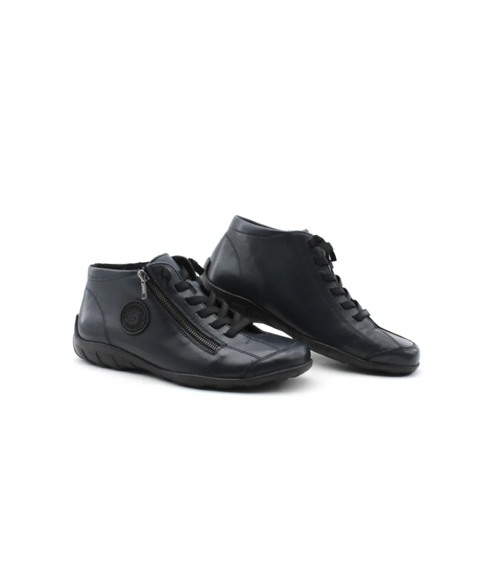 Remonte R3491-15 est une tennis femme en cuir bleu. Cette tennis montante Remonte est facile à chausser grâce à son lacet élastiqué et sa fermeture éclair. Ce modèle de tennis Remonte est doté d’une semelle amovible et de la technologie Remonte Soft : Matière respirante, résistante à l’humidité et semelle avec un bon amorti.