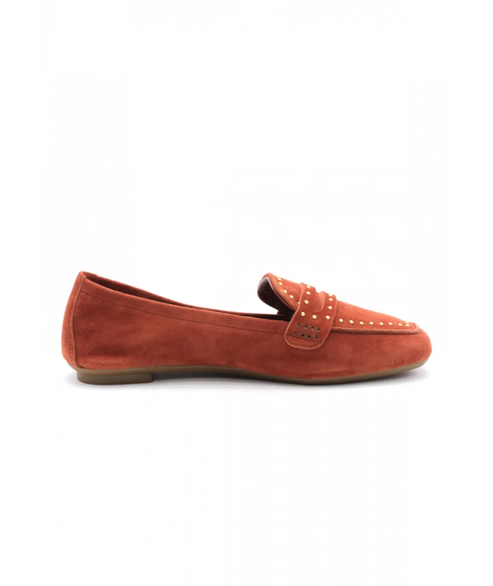 Joli mocassin en cuir velours brique chic et confortable. L’Empreinte Chaussures vous dévoile le nouveau modèle HELODIE de la maison française Reqins et qui plaît déjà aux femmes à la recherche de modernité et d’élégance. Ce mocassin est une véritable pépite avec sa semelle fine en gomme pour la légèreté et votre confort ainsi que ses clous dorés sur le dessus du pied pour un rendu féminin.