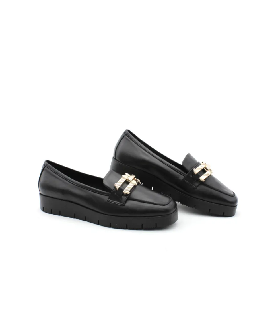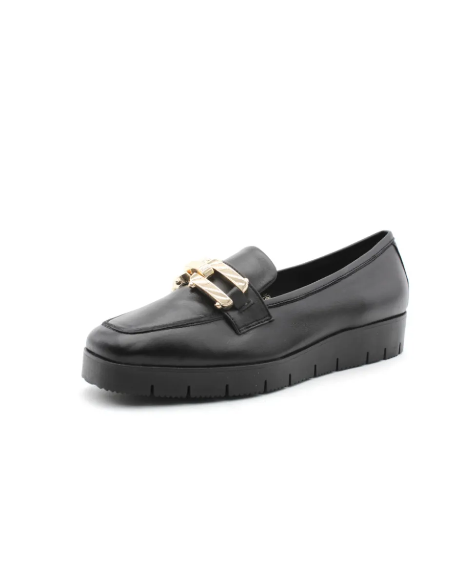 Joli mocassin en cuir noir chic et confortable. L’Empreinte Chaussures vous dévoile le nouveau modèle NEOR de la maison française Reqins et qui plaît déjà aux femmes à la recherche de modernité et d’élégance. Ce mocassin est une véritable pépite avec sa semelle compensée en gomme très légère et confortable ainsi que son mord doré sur le dessus du pied pour un rendu féminin. Un must have de la collection ! N’attendez plus…