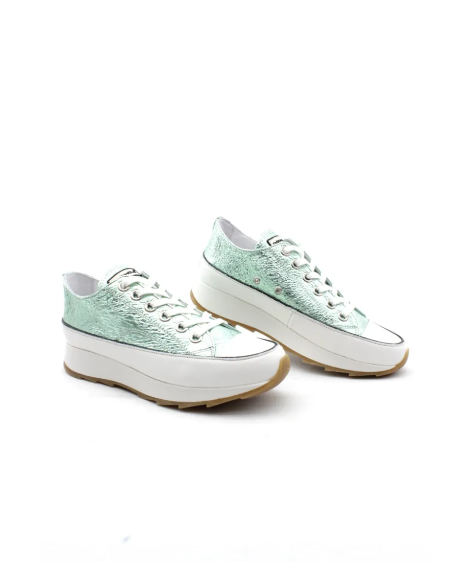 FRASSETO H0755B, une basket ultra-originale pour un look tendance, voici la dernière création de ROSEMETAL. Sur une grosse semelle compensée et une palette de couleur disponible, la mode est à vos pieds ! Une semelle blanche imposante, un dessus en cuir métallisé platine et vert, pas de doute c’est le must-have de cet été ! Confortable et looké, on aime la semelle marron au style rétro !