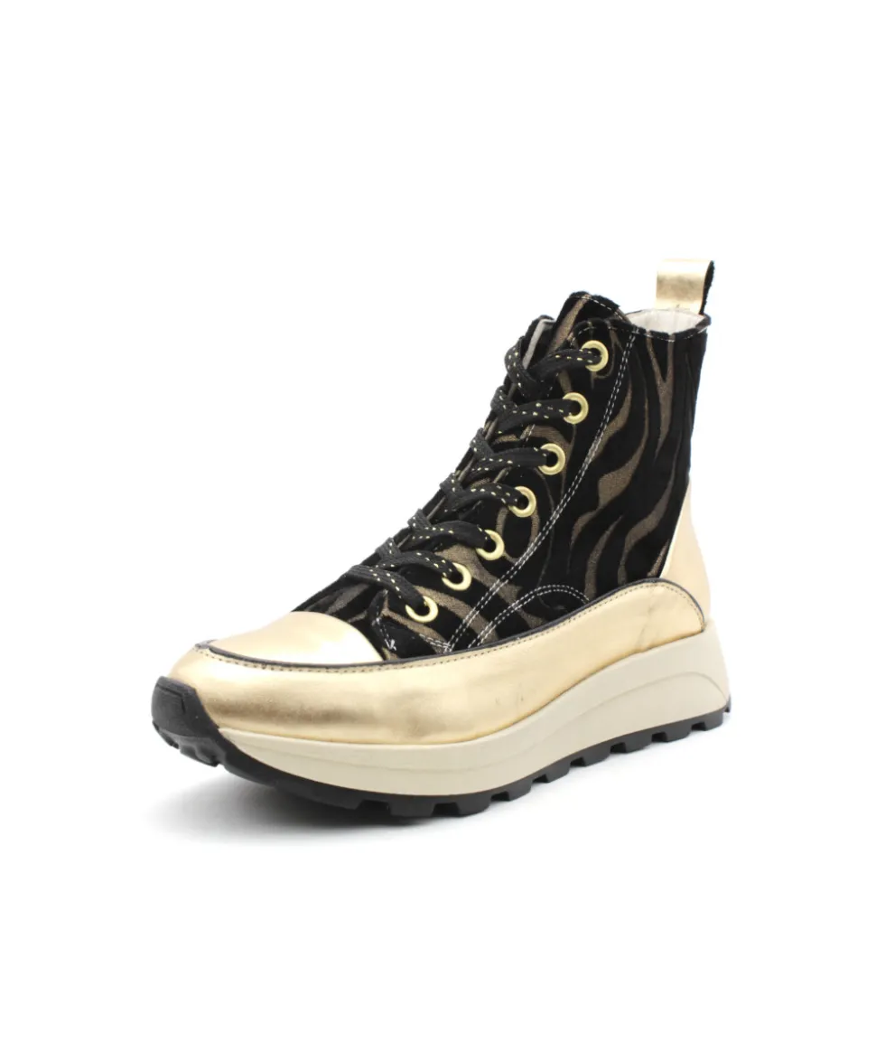 FRESSE H0793I, une basket ultra-originale pour un look tendance, voici la création de ROSEMETAL. Sur une semelle compensée et disponible en cuir noir, bronze et or, la mode est à vos pieds ! Avec une semelle beige imposante, des oeillets et une languette sur le contrefort doré,… pas de doute c’est le must-have de la saison ! Confortable et looké, on aime la portée à toutes les occasions !