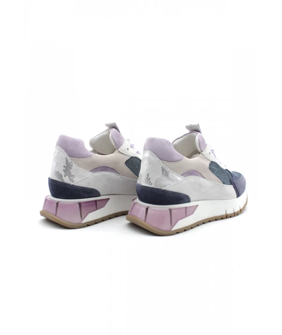 Sur une semelle épaisse, la sneaker est assemblée sur un mélange de cuir bleu violet rose et blanc, son lacet plat donne du caractère tandis que sa semelle crantée et ajourée vous offre tout le confort souhaité.