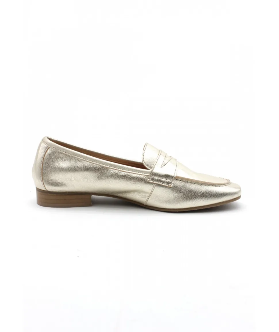 WE DO, une nouvelle marque chez L’Empreinte Chaussures, propose cette saison un mocassin très féminin en cuir platine or, décoré d’un empiècement en cuir chic sur le dessus du plateau.