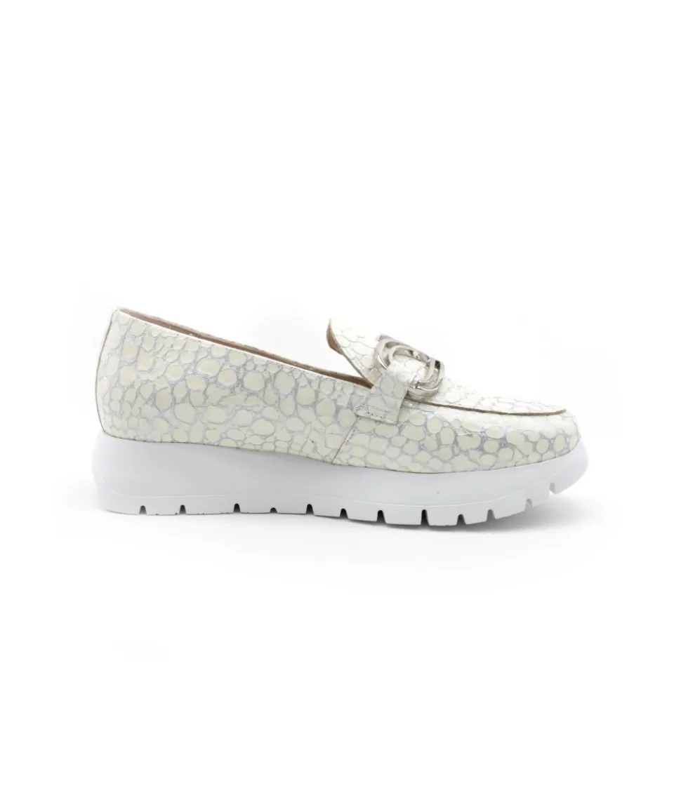 Joli mocassin en cuir orange et serpent argent proposé par la maison espagnole Wonders. Le modèle A2462, une forme bi…