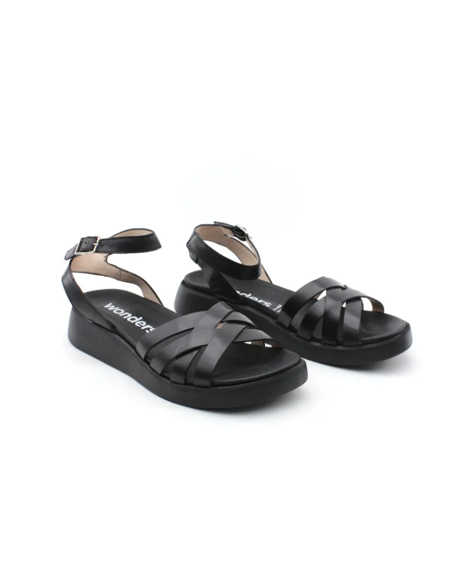 Magnifique sandale sur un bloc compensé de 3,5 cm. Voici la dernière création de la maison espagnole WONDERS avec son modèle C6521 disponible en cuir noir. Sa semelle, légère et confortable apporte un véritable look moderne et tendance tandis que ses brides croisées avant apporterons un look rétro chic. On aime sa bride arrière réglable qui apporte du maintien lors de la marche. Il ne vous reste plus qu’à profiter !