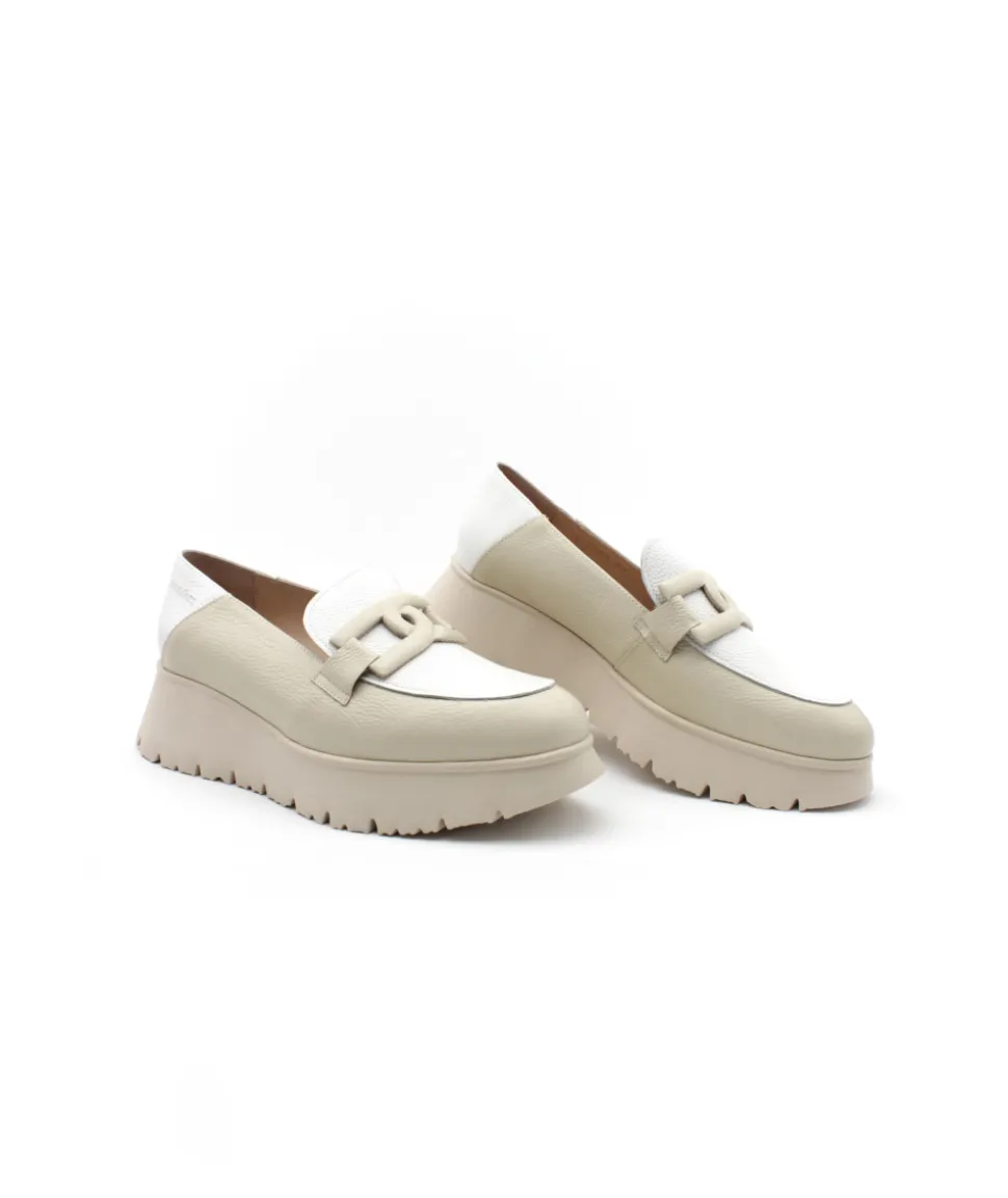 Joli mocassin en cuir bicolore crème et blanc proposé par la maison espagnole Wonders. Le modèle C7301, une forme bien connue de Wonders, casse les codes pour un look original et atypique, montée sur une semelle compensée, cette chaussure vous accompagnera partout grâce à son confort de marche. On aime le bijou tendance présent sur le plateau avant qui apporte de l’élégance au mocassin.