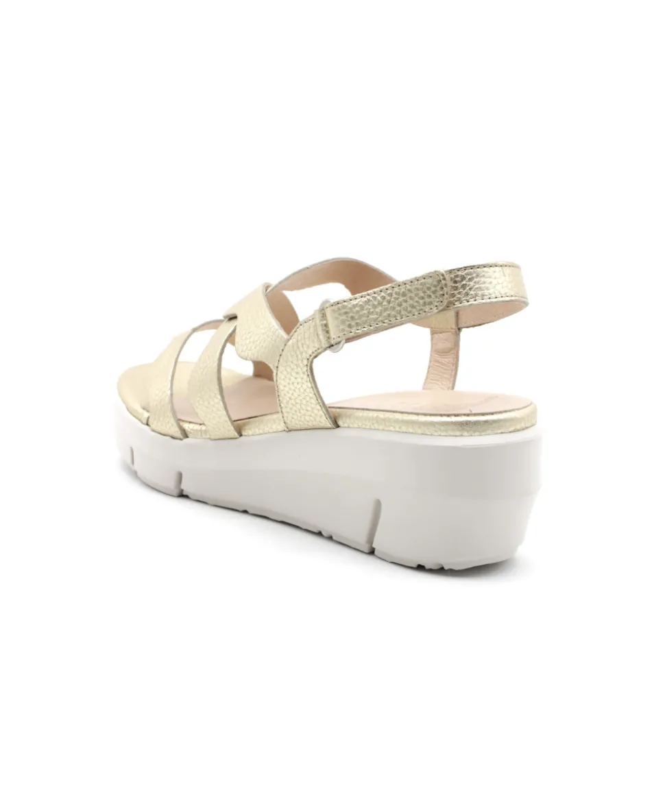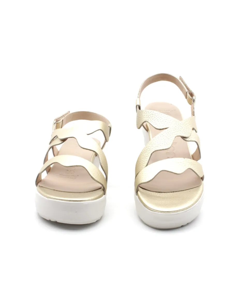 Magnifique sandale sur un bloc compensé de 5 cm. Voici la dernière création de la maison espagnole WONDERS avec son modèle D8280 disponible en cuir couleur or. Sa semelle, légère et confortable apporte un véritable look moderne et tendance tandis que ses brides originales et joliment travaillées apporterons un look rétro chic. On aime sa bride arrière réglable qui apporte du maintien lors de la marche. Il ne vous reste plus qu’à profiter !