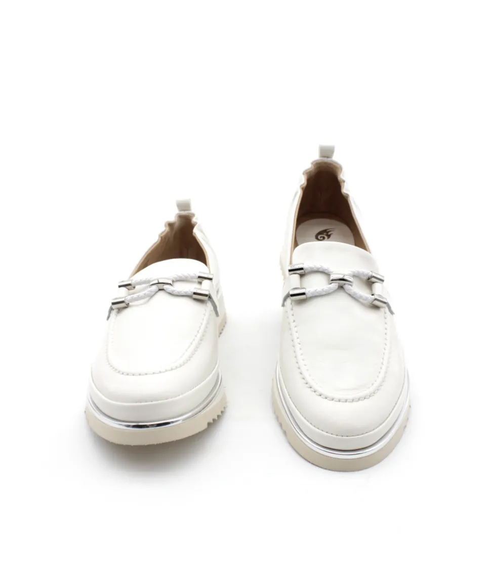 Magnifique mocassin à talon compensé de la maison Italienne XSA. Aussi élégant que le reste de la gamme, le nouveau modèle 9853 donne un nouveau look au mocassin en s’associant à une semelle compensée plus décontractée tout en conservant son apparence chic et féminin. Revêtu d’un cuir ivoire et d’un bijoux, cette chaussure pour femme deviendra rapidement la star de votre shoesing !