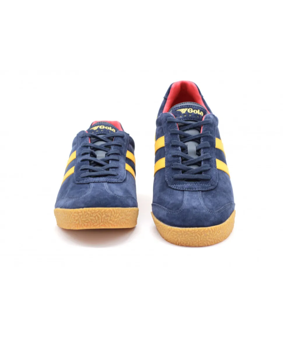 À la recherche d’une jolie basket tendance et originale ? La nouvelle GOLA est faite pour vous avec ce modèle de sneaker HARRIER CMA192 dans son coloris en cuir nubuck bleu marine. Le must-have des baskets branchées pour cette saison au look sport / chic équipées de bandes jaunes sur le côté. Sur une semelle en caoutchouc marron, cette chaussure pour hommes vous charmera forcément par sa légèreté et sa souplesse. Ses lacets quant-à eux vous apporterons beaucoup de maintien. N’attendez plus, ce sont les baskets modernes qu’il vous manquait !