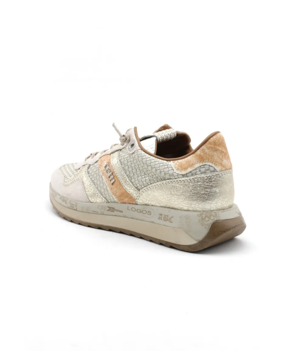 Forme restylisée pour cette nouvelle saison du modèle C1274 TRECHIA CHAMPAGNE signé par la maison espagnole CETTI. Disponible en cuir couleur platine gold, cette sneaker tendance nous surprend par son joli mélange de matière et de couleur…. Avec ses empiècements en cuir métallisé et son impression tressée, cette basket habillera chacune de vos tenues. Ses lacets élastiqués et sa semelle en cuir moussé amovible vous surprendront par son confort et sa facilité d’enfilage. Sa semelle en gomme épaisse, vous rehaussera de 3 cm sans perdre de souplesse.
