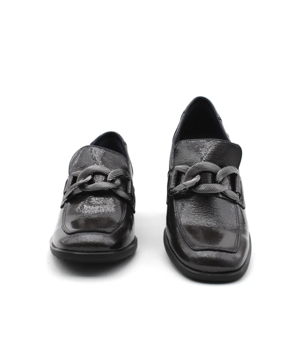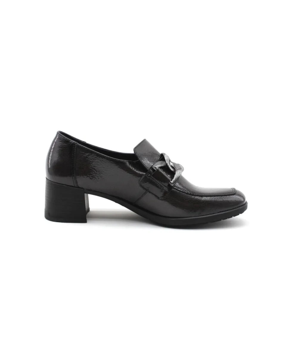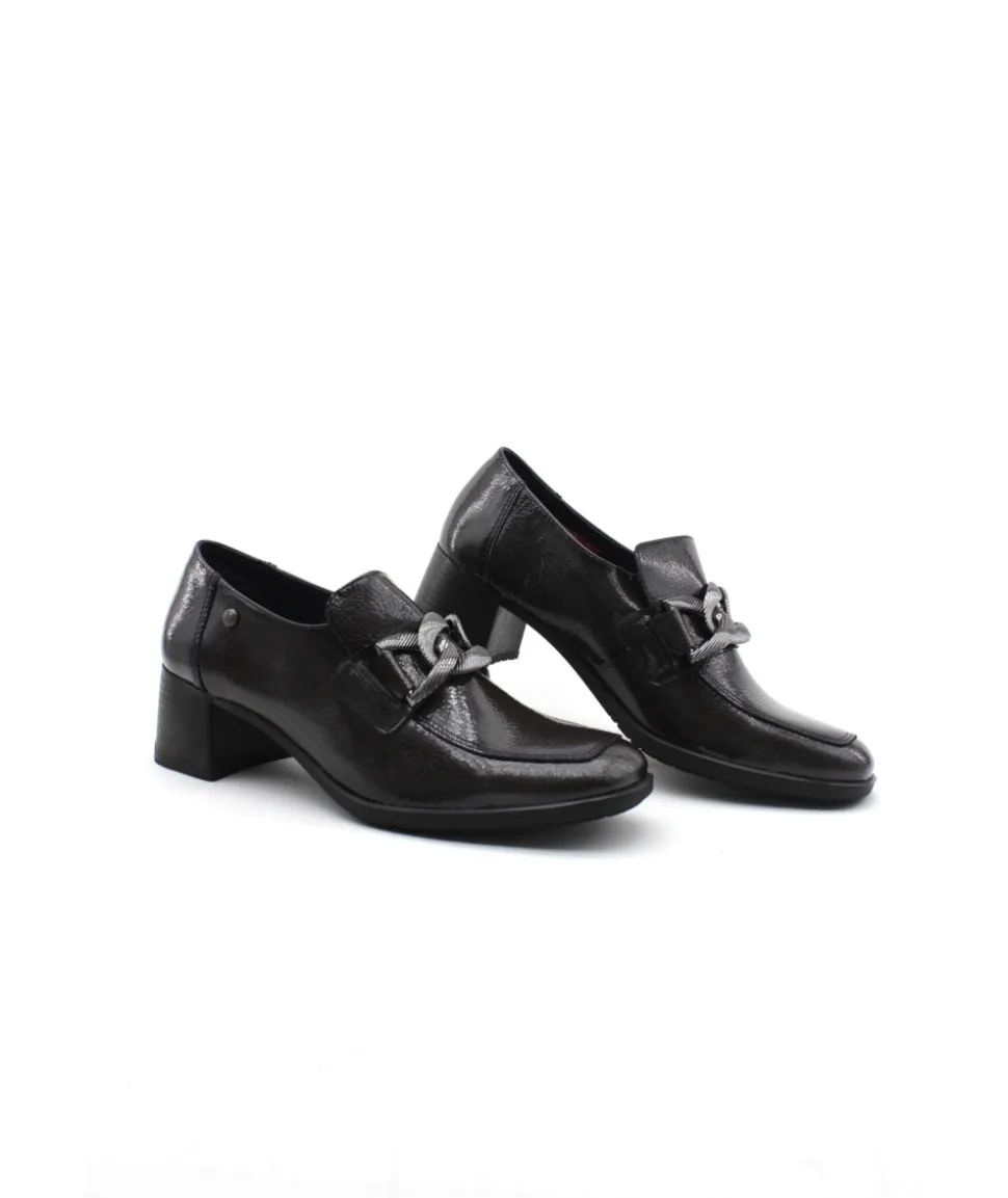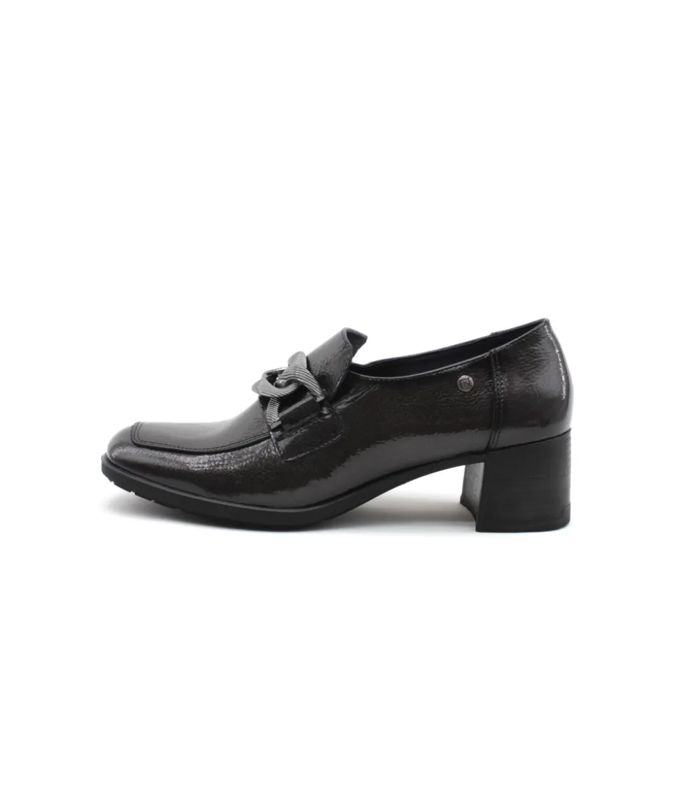 Une nouvelle forme fait son entrée dans la collection avec le mocassin à talon pour femme D9197 IKIA en cuir vernis ta…
