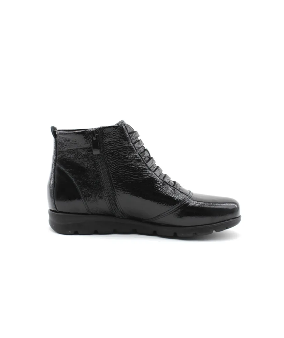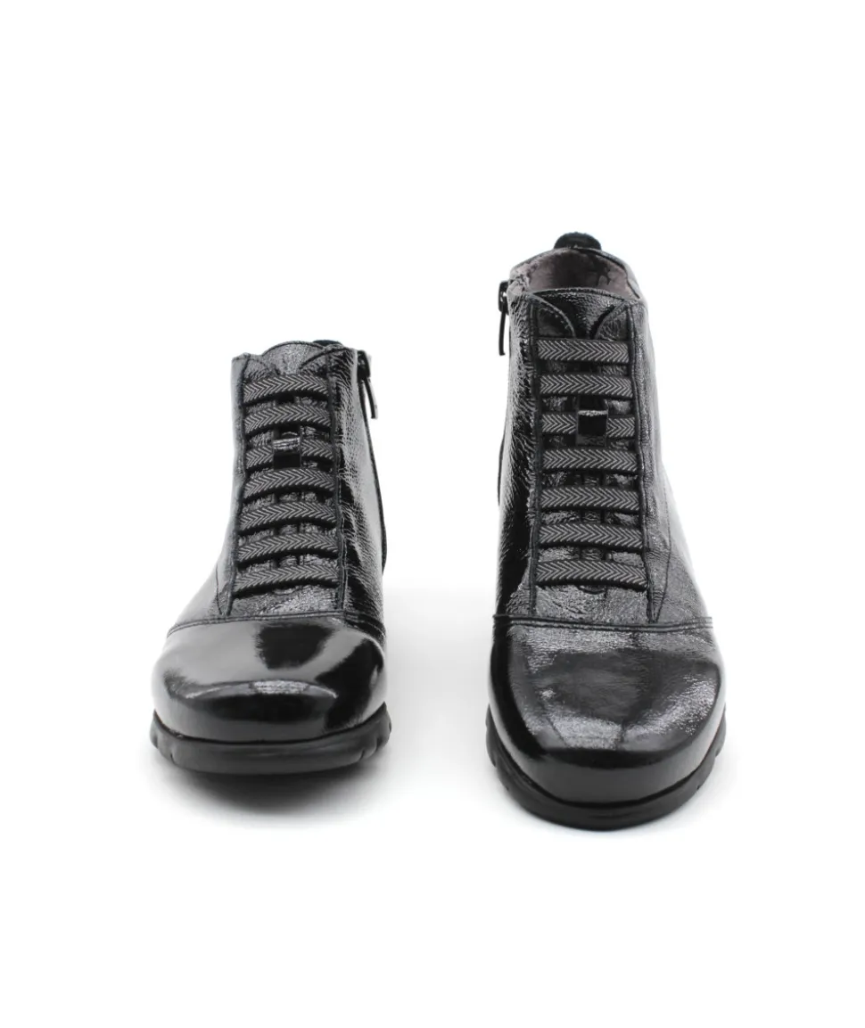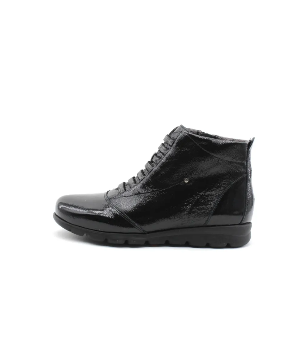 FLUCHOS propose pour la femme à la recherche de confort la bottine SUSAN F0356. Un cuir vernis noir très souple, une semelle gomme légère et un laçage élastique qui procure une grande aisance. Pratique à enfiler grâce à son zip intérieur, ce modèle est un indémodable de la collection de par son look que le confort que cette chaussure montante procure ! Pas de doute, vous n’arriverez plus à vous en passer !
