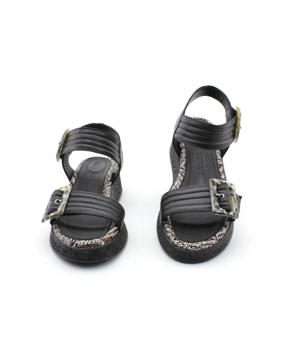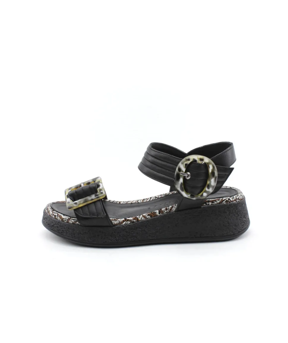 Sandale compensée originale et élégante grâce à son cuir de qualité couleur noir. Le modèle KRALOO signé FUGITIVE est un véritable succès grâce à ses brides réglables par velcro camouflées sous ses boucles tendances. Son cuir et sa semelle apportent confort et maintien pour vous accompagner dans tous les jours. On aime aussi sa semelle agrémentée de jolis motifs pour un look unique.