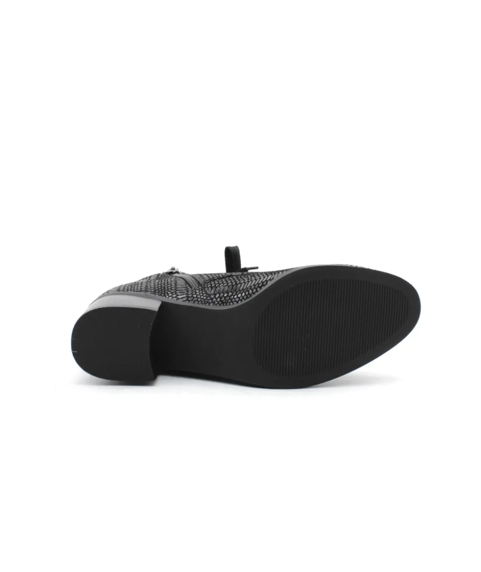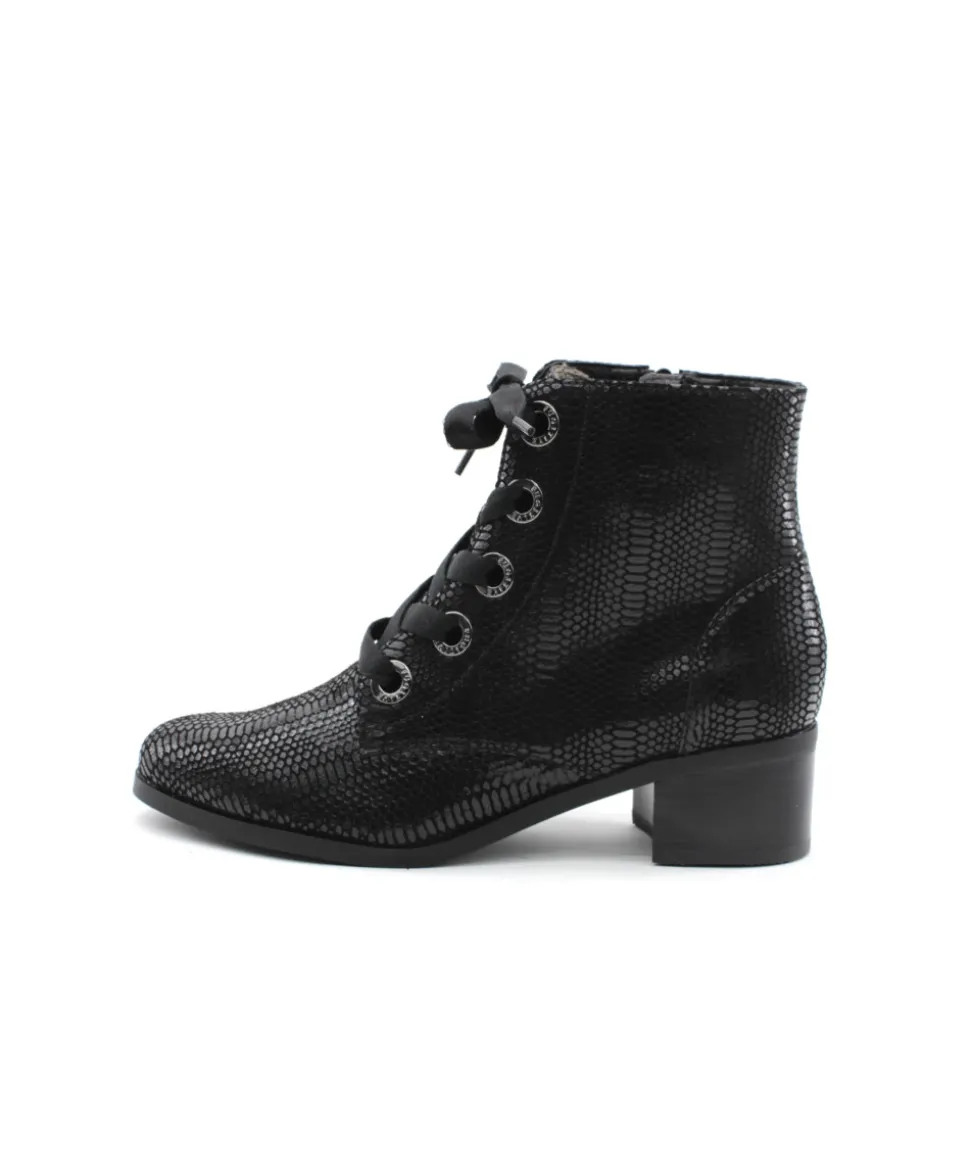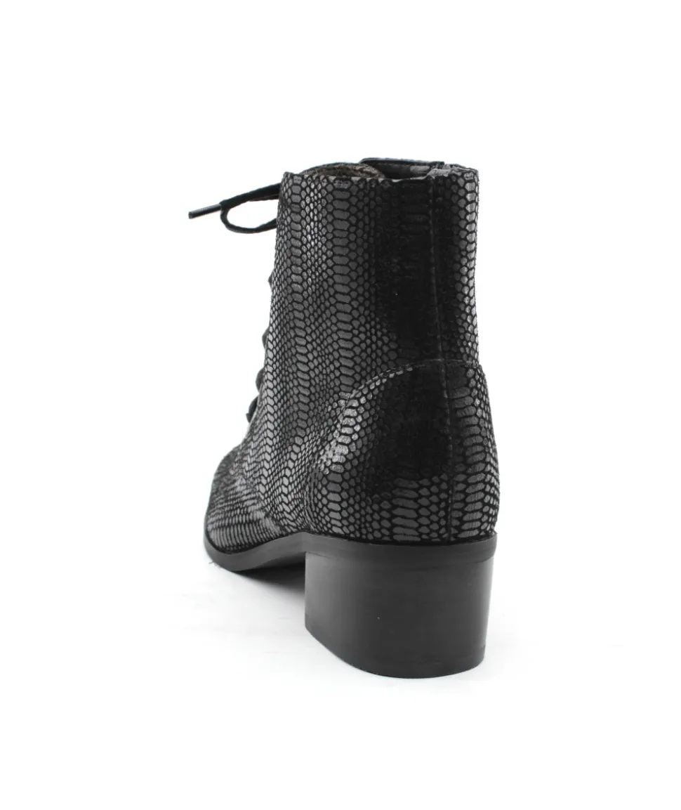 À la recherche d’une bottine confortable qui vous fera prendre un peu de hauteur ? La création RADIEU revient cette saison dans un superbe cuir noir impression python avec ses reflets argentés. Chic et tendance avec ses oeillets imposant et son lacet plat, cette boots vous comblera de bonheur par sa cambrure parfait et son talon de 4 cm. Son originalité et son look atypique ne vous fera pas passer inaperçu.