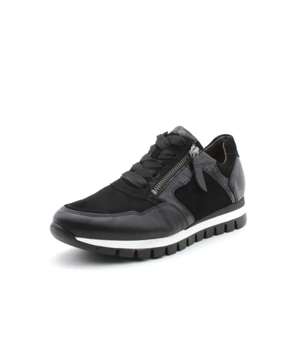 À chaque femme sa paire de basket. Cette fois, nous vous présentons la nouvelle GABOR 36.438.67 en cuir velours noir accompagnée d’empiècements en cuir lisse et croco. Chic et élégante, cette paire de sneaker confortable se montre à l’aise dans toutes les situations grâce à sa semelle rainurée qui offre beaucoup de souplesse. Son lacet viendra s’ajuster à votre pied tandis que ses zips de fermetures vous faciliteront l’enfilage. Plus de doute, c’est la paire qu’il vous faut !