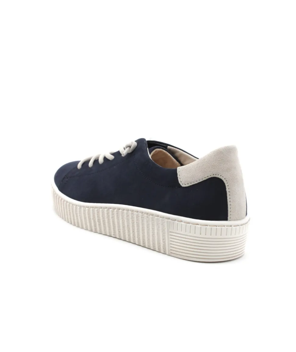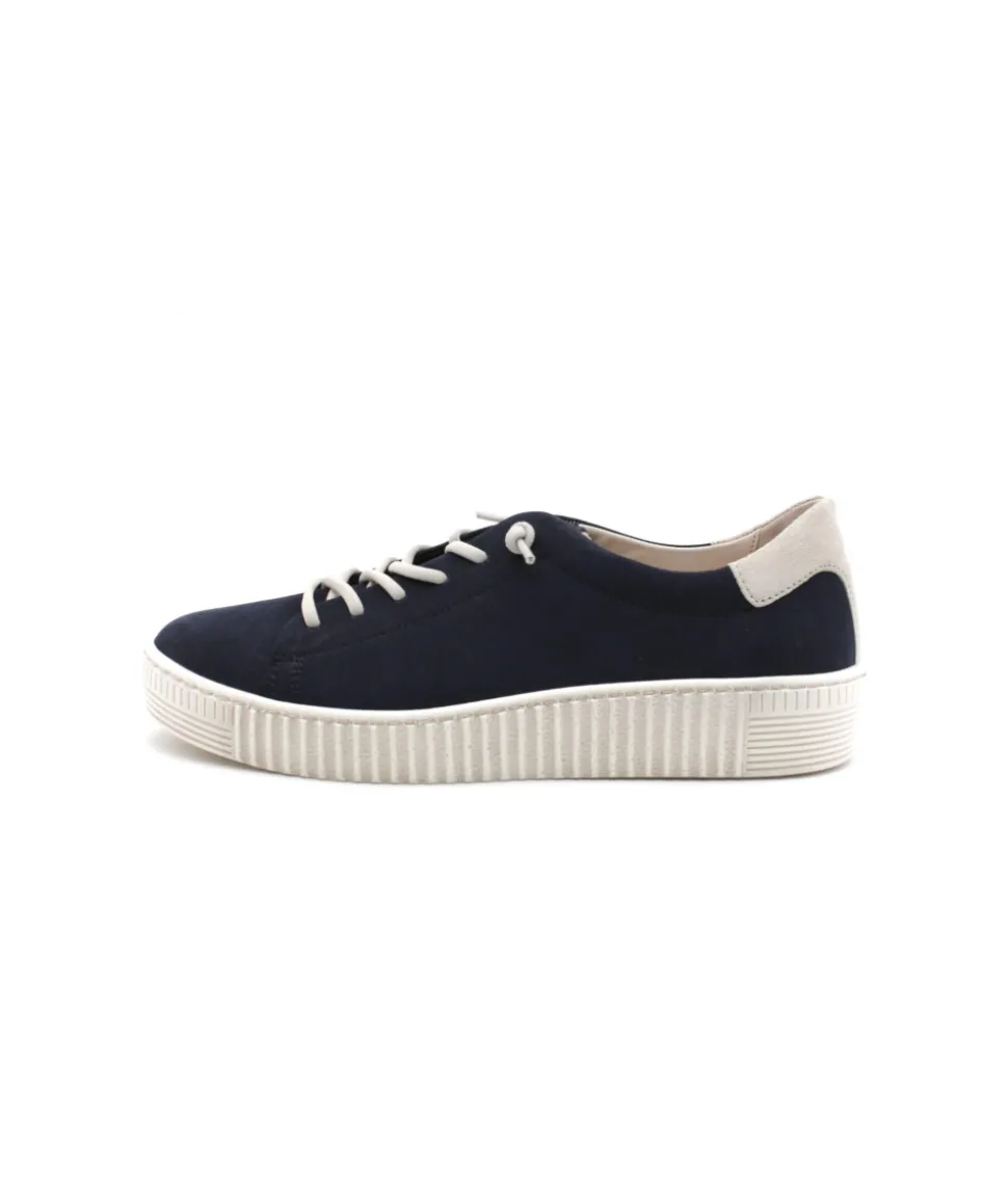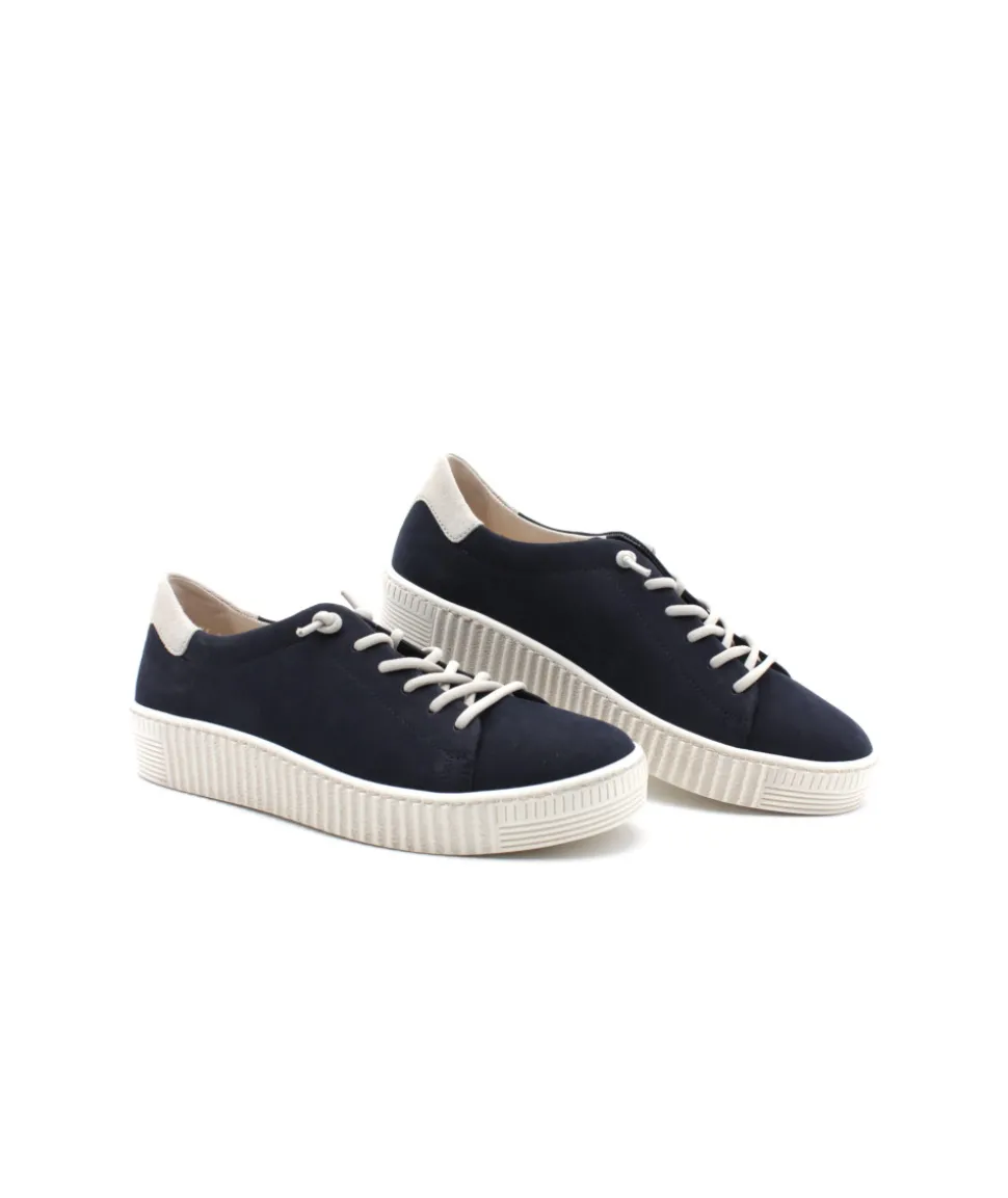 Nouvelle déclinaison de la basket phare de GABOR. Pour cette nouvelle saison, la maison allemande relance sa sneaker sport chic 43.331.16 en cuir bleu marine qui lui donne un look moderne et indémodable mais cette fois, fini le zip et le lacet plat, voici la version lacets élastiqués ! Son cuir velours apporte beaucoup de souplesse tandis que son lacet maintienne le pied pour un maximum de confort. Vous ne serez jamais déçu par ce modèle !