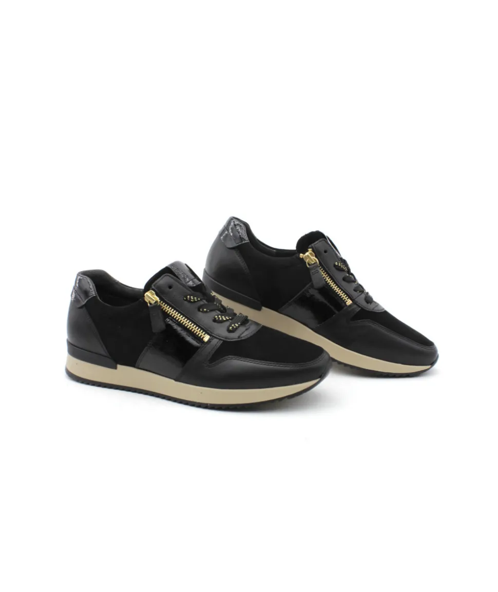 La maison allemande GABOR nous dévoile sa dernière création, le modèle 53.420.47 dans son coloris noir vous fera craquer par sa légèreté et son confort de marche. Avec une semelle amovible, un zip de fermeture et un lacet ces sneakers sport chic deviennent le modèle pratique et tendance qu’il vous faut ! On aime les détails dorés qui ajoute une touche de féminité.