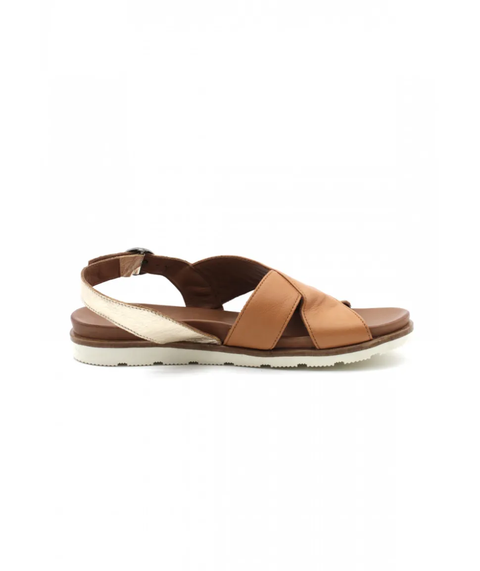Nu-pieds en cuir BLANC ET CAMEL proposé par la marque Portugaise LUNE et L’AUTRE. Il s’ajuste par une bride à boucle sur l’arrière du pied. Une semelle caoutchouc blanche très confortable vient compléter cette sandale.