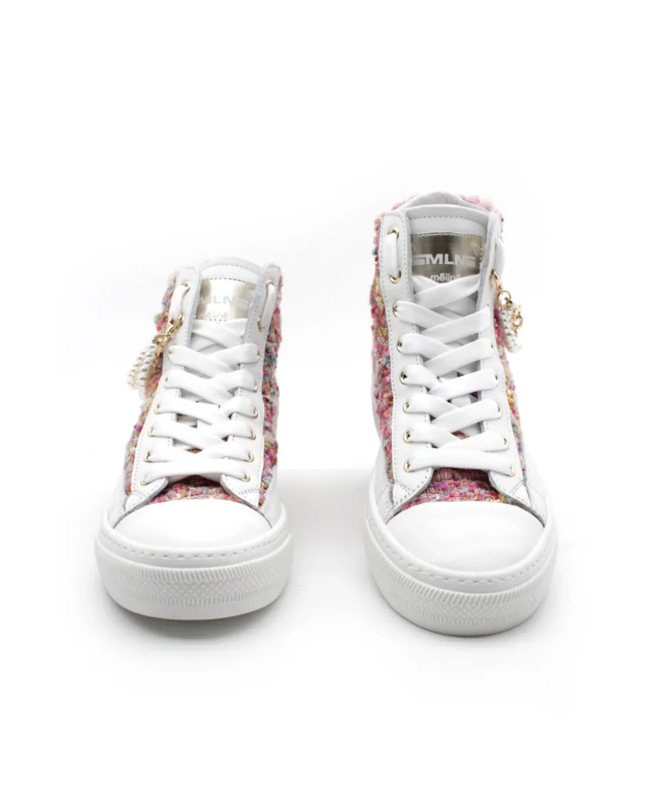 La maison italienne MELINE fait son retour cette année avec de nouvelles créations toujours plus originales ! Et voici le modèle HE202-CAT2 en couleur blanc associé à un tweed rose fuchsia. Une basket montante sport / chic pour tous les jours avec un super look. Avec sa chaine doré amovible accompagnée d’une chaine en perle, cette sneaker pourra facilement s’associée à vos tenues tout en profitant d’un style unique.