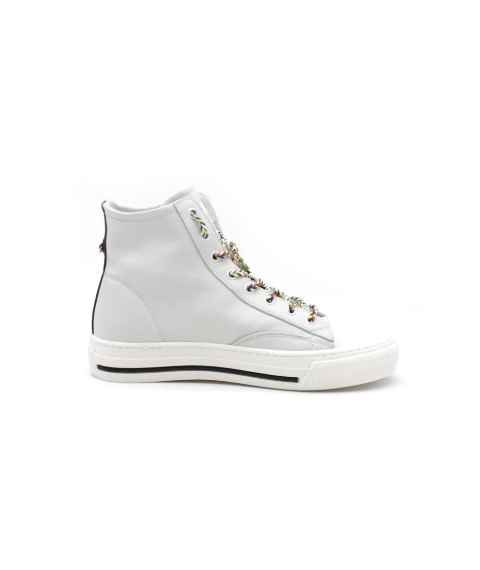 La maison italienne MELINE fait son retour cette année avec de nouvelles créations toujours plus originales ! Et voici le modèle HE202-CAT3 en couleur blanc. Une basket montante sport / chic pour tous les jours avec un super look. Avec ses lacets originaux, sa chaine doré amovible accompagnée de bijoux multicouleurs, cette sneaker pourra facilement s’associée à vos tenues tout en profitant d’un style sobre mais unique.