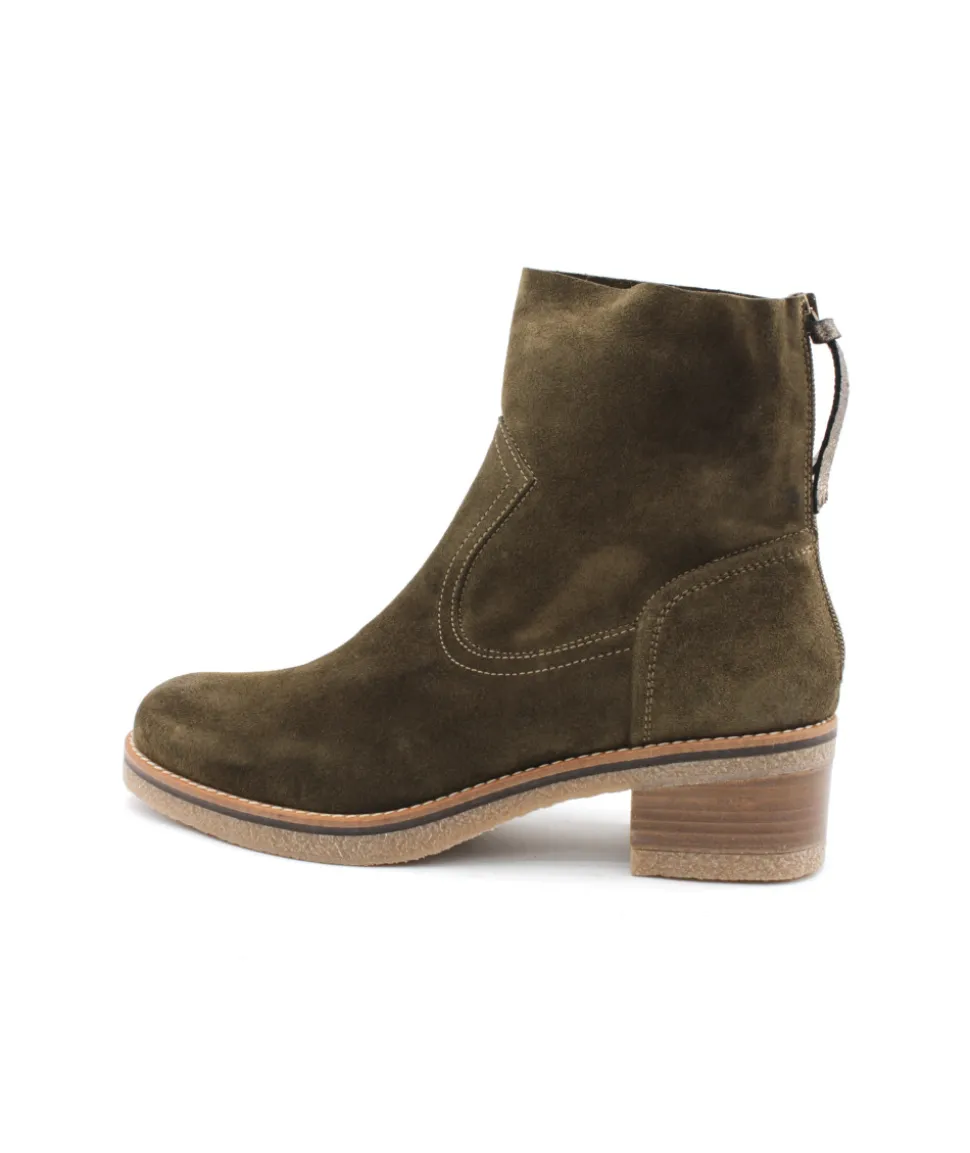 Jolie bottine de la maison MKD en cuir velours kaki camel et bleu marine. Voici le modèle BASILE CRUTE et son talon décroché de 5 cm qui vous fera prendre de la hauteur tout en conservant une cambrure confortable. Son cuir souple, agréable à porter s’équipe d’un zip arrière pour plus de praticité. Sa semelle crêpe offre quant-à elle beaucoup d’amorti pour un confort de marche optimal.